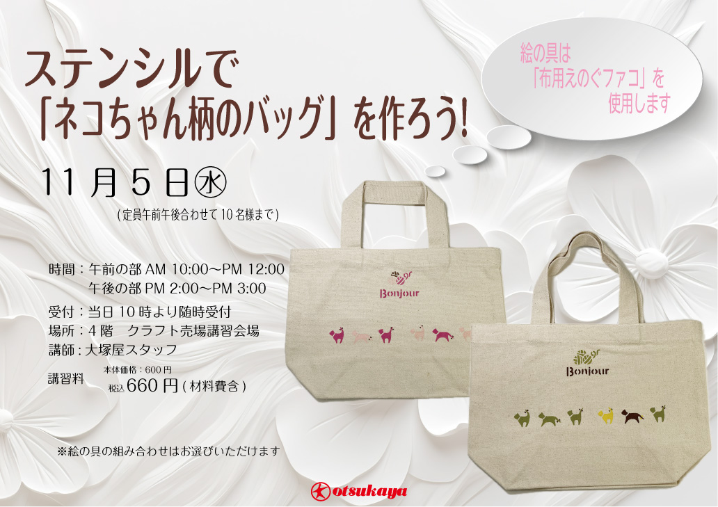 ステンシルで「ネコちゃん柄のバッグ」を作ろう 車道本店4Fクラフト売場1105