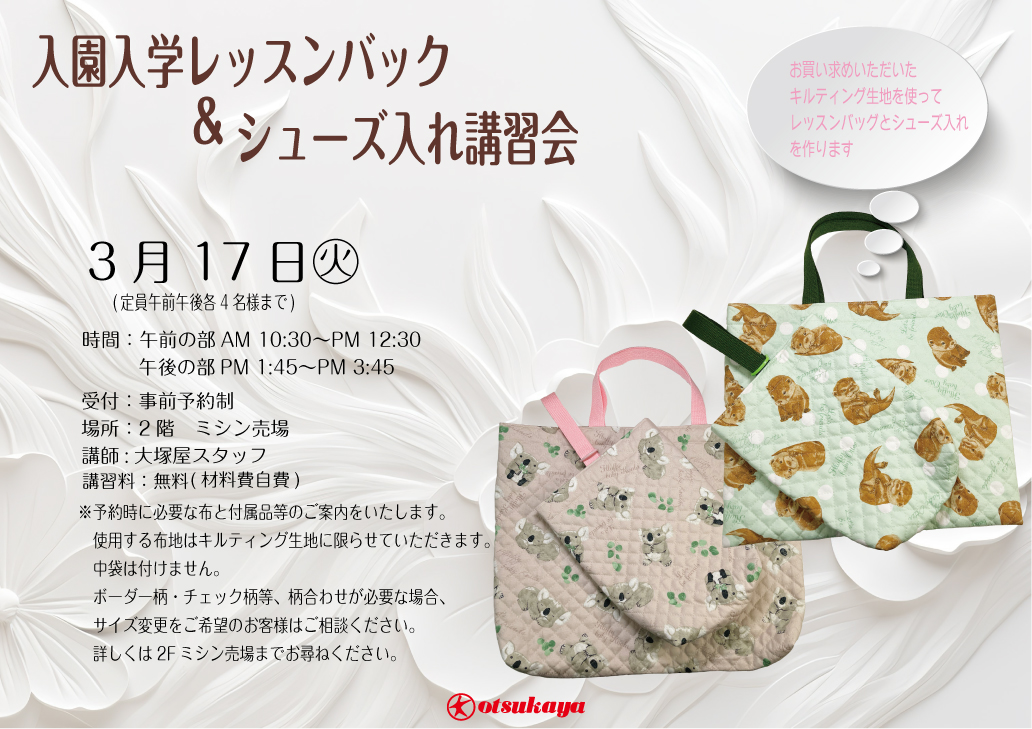 入園入学レッスンバッグ&シューズ入れ講習会 車道本店2Fミシン売場0317