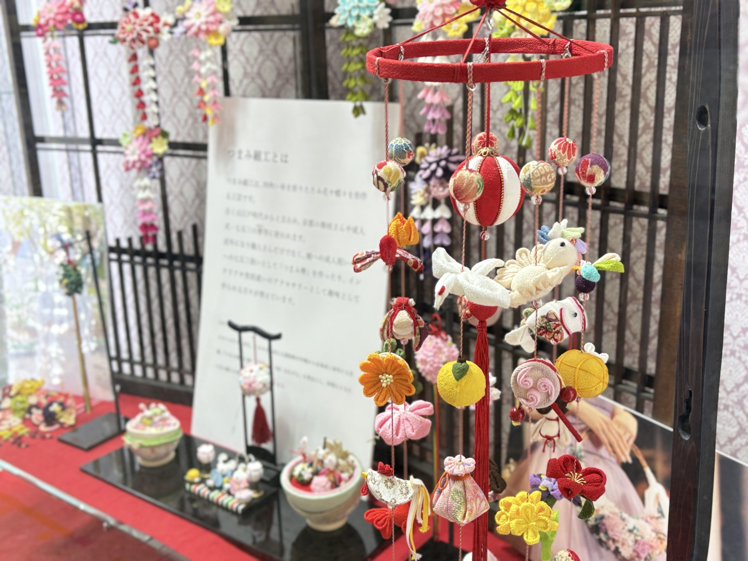 併せて4月12日まで、車道本店1階東口エントランスでは美しいつまみ細工作品の展示も行っています。
