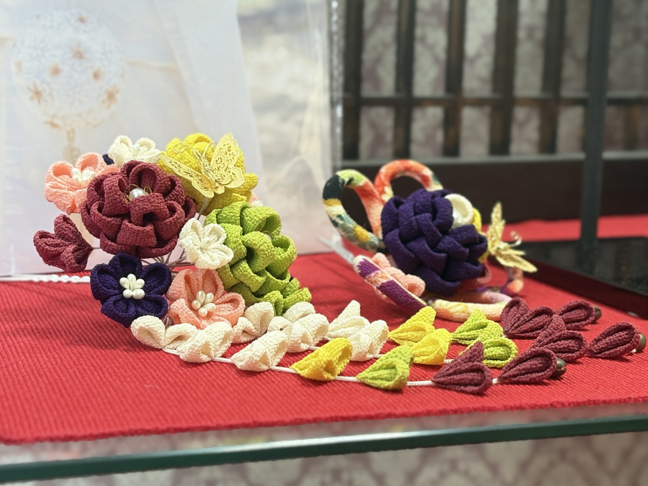 つまみ細工とは、四角い布を折りたたみ花や蝶々を形作る工芸です。例えば、成人式や七五三の簪(かんざし)に用いられます。