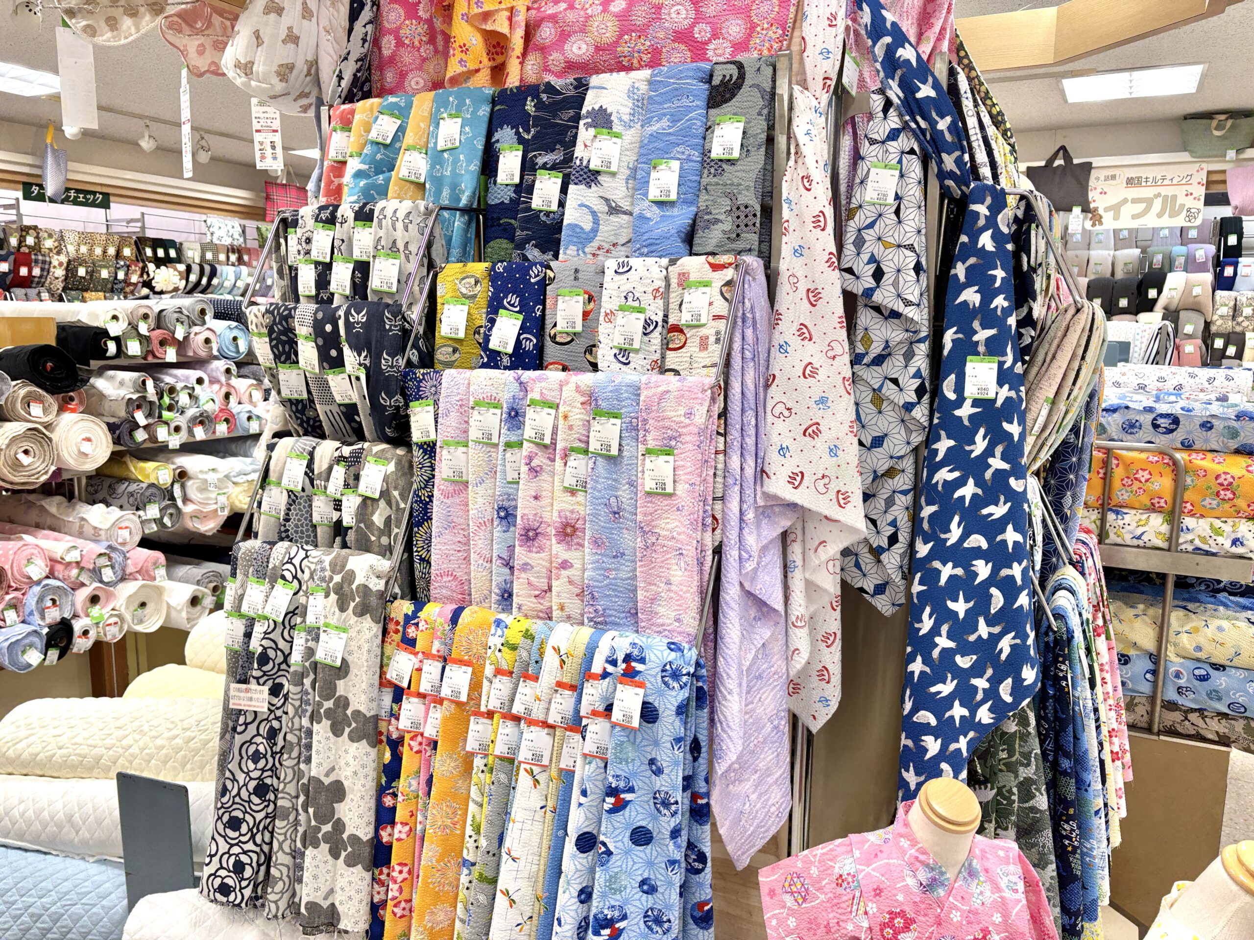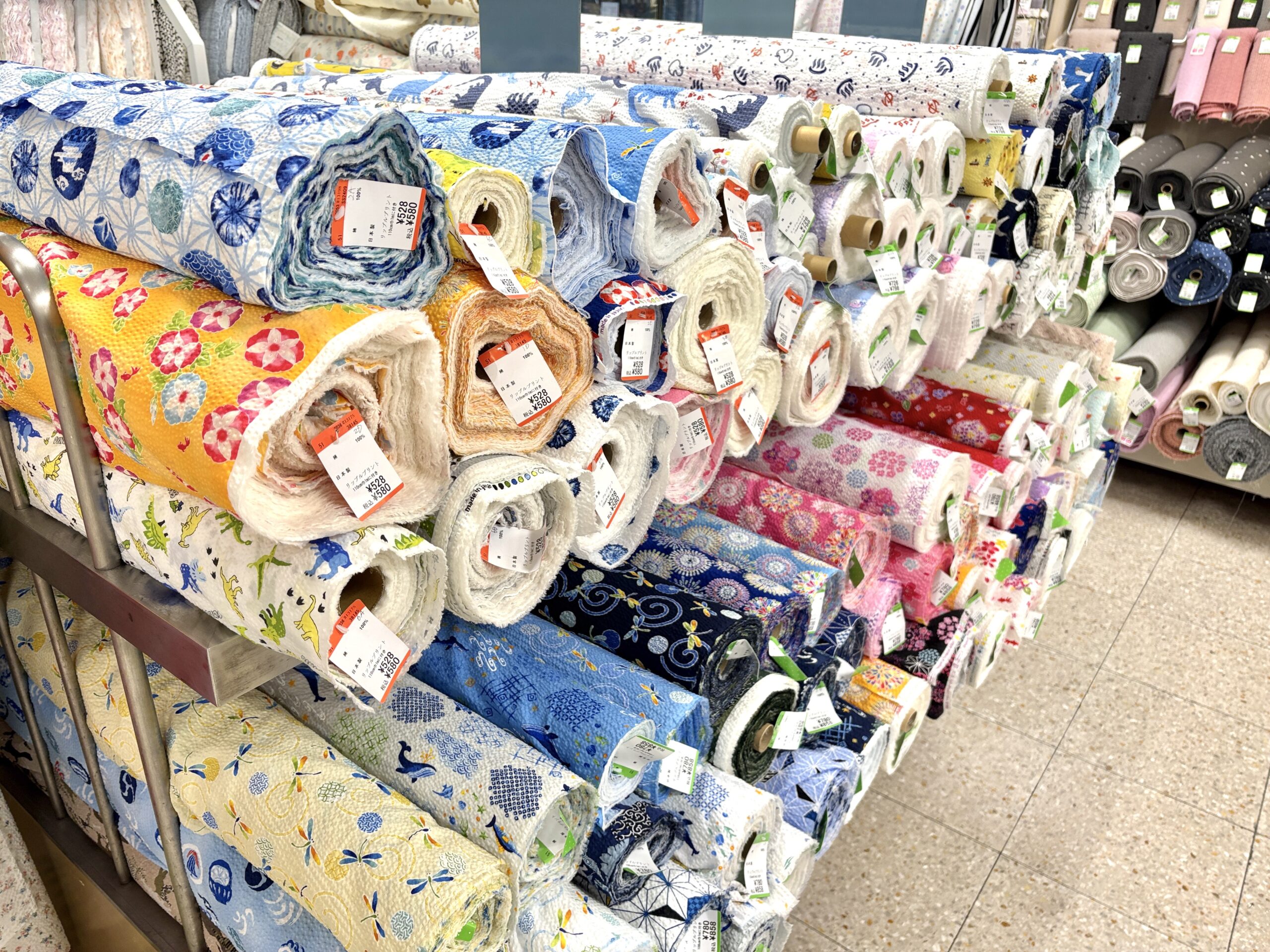 ここは、大塚屋車道本店1階の、主にキッズ向けのプリント生地を扱うコーナーです。