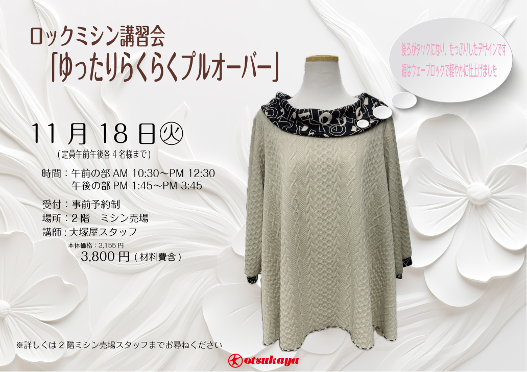 ロックミシン講習会「ゆったりらくらくプルオーバー」 車道本店2Fミシン売場1118