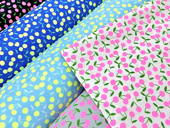 ネオンチェリーのシーチングプリントビビットポップでかわいい!明るいトーンが目に鮮やかな蛍光カラーのさくらんぼがデザインされたシーチングプリントです。