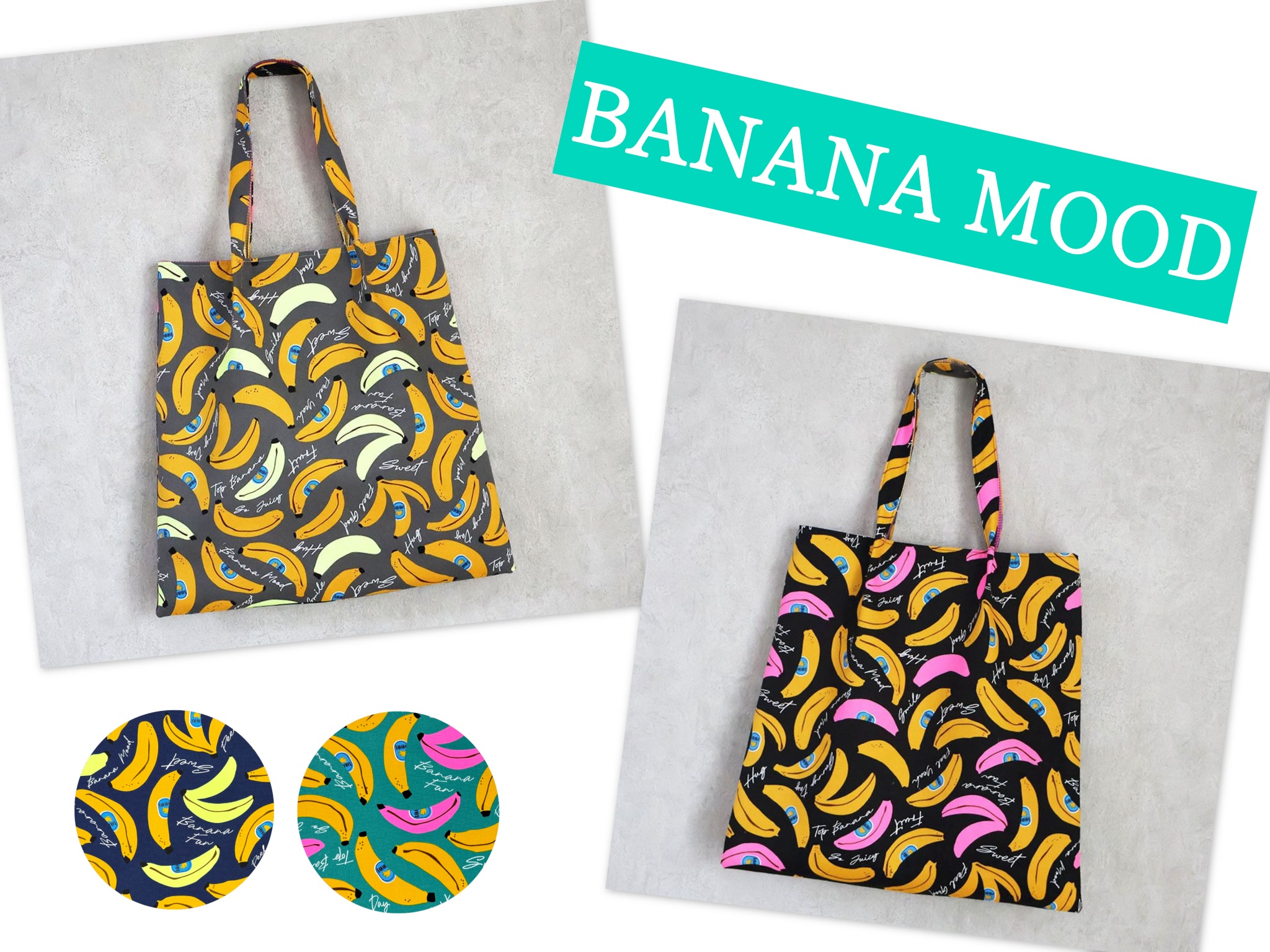 バナナモチーフと蛍光カラーが組み合わさった、クールでお洒落なオックスプリント生地です。