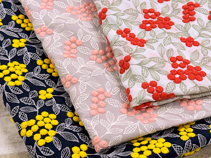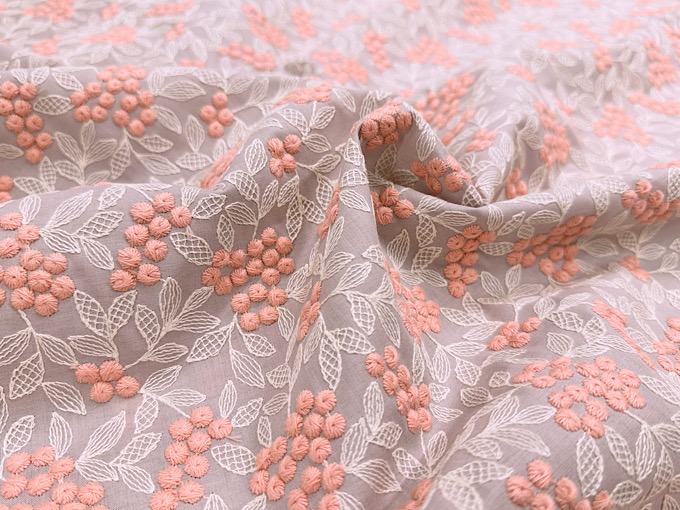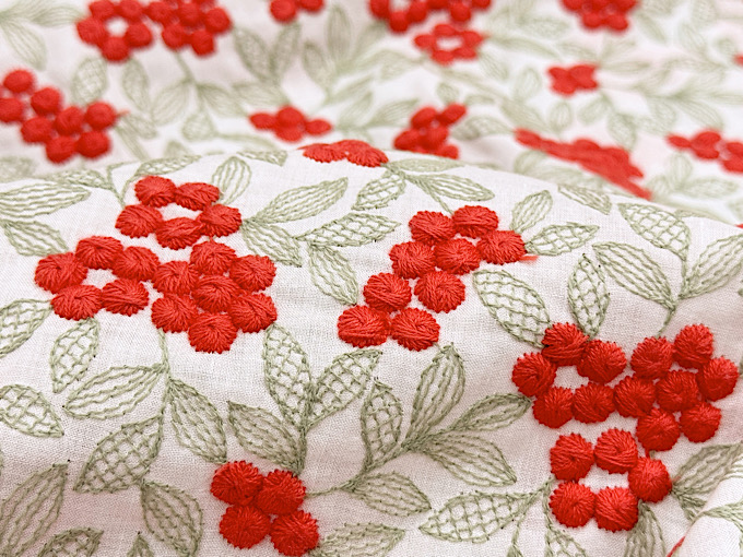 2色の刺繍糸をたっぷりと使用することにより、立体的でまん丸な木の実と繊細な葉脈を表現した、美しいコットンローンレースファブリックです。