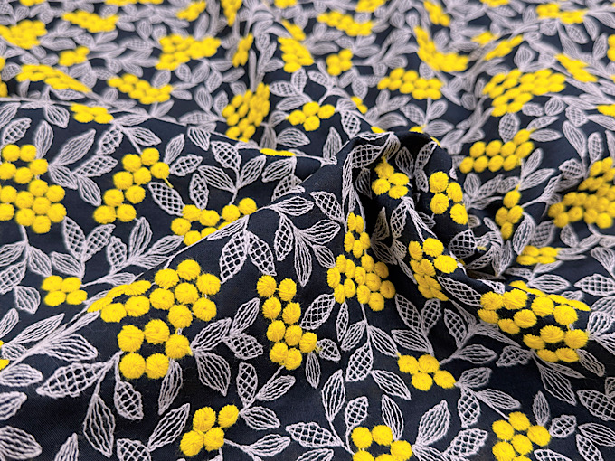 華やかなデザインと程よい透け感が特徴で、非常に軽量なのも魅力的。ジャケットやセットアップ、バッグのハンドメイドにおすすめです。