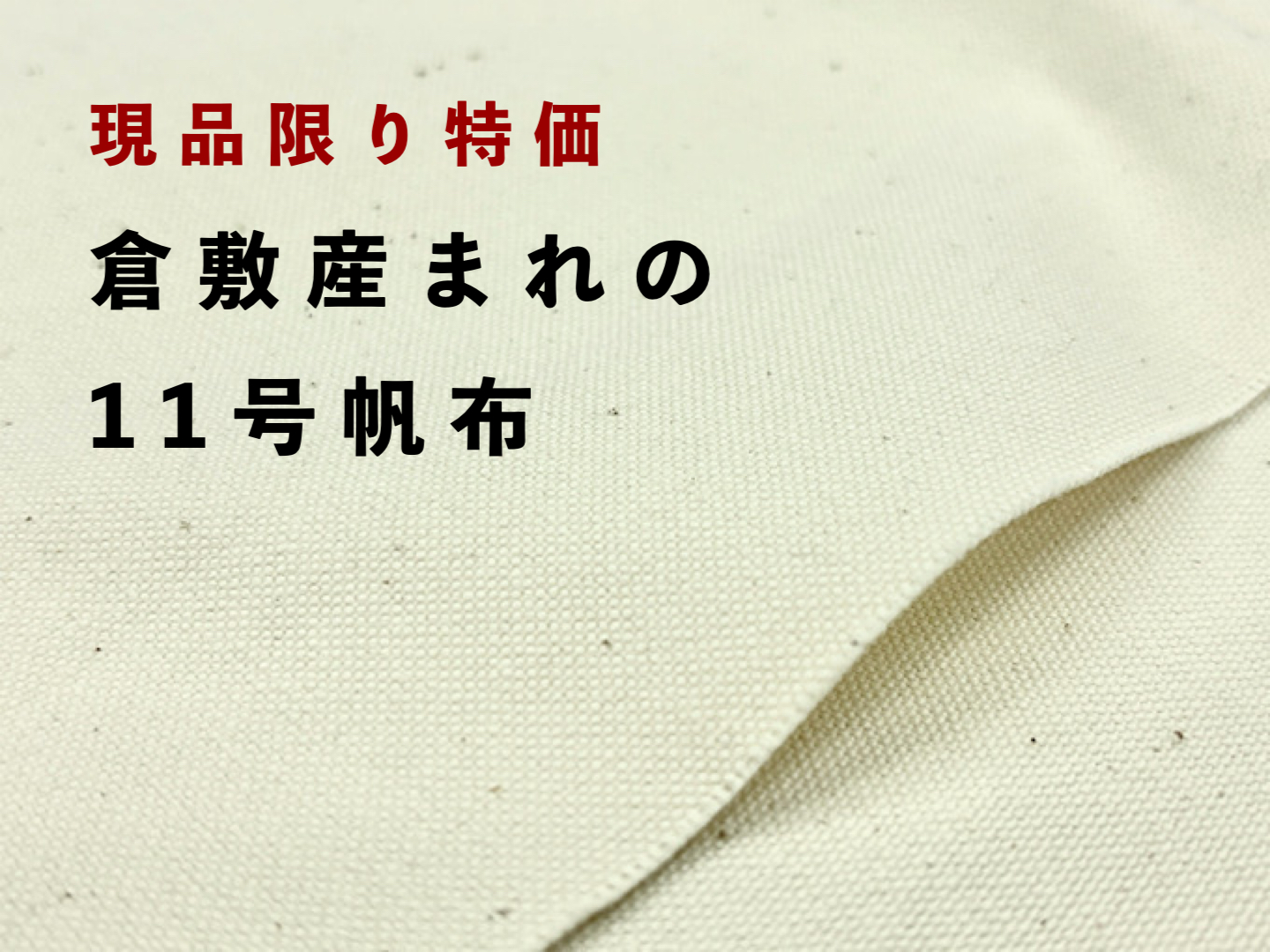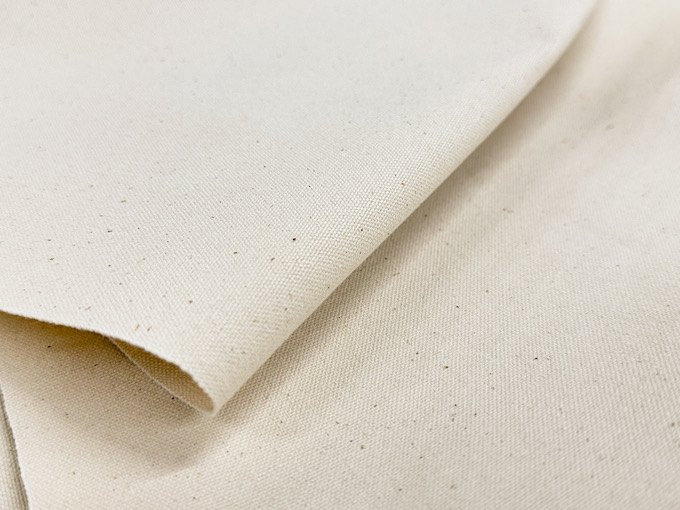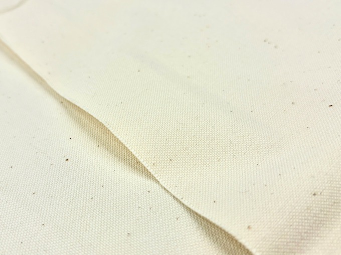 帆布本来の風合いを楽しめる生成(綿カス(黒いツブ)残し)、帆布やデニムの名産地、岡山県倉敷市で製造された肉厚な9号帆布無地です。