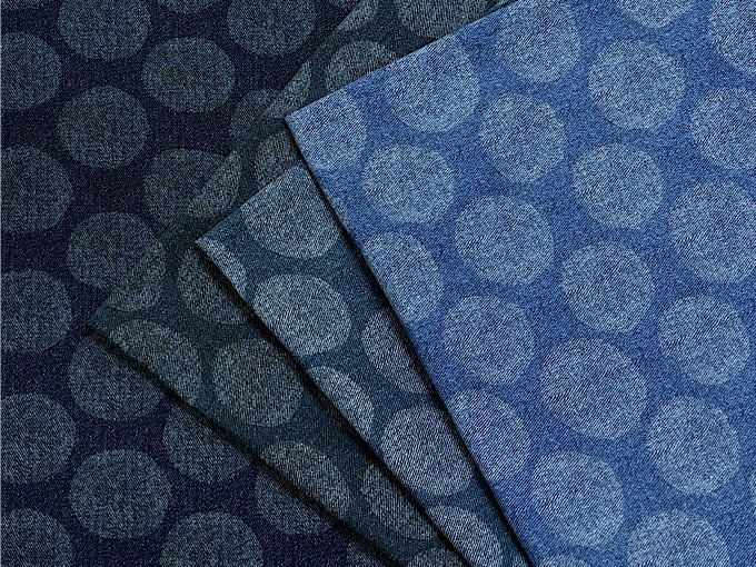 リアルなデニム(ジーンズ)調プリント生地と使いやすい大きさの水玉模様が組み合わさった大塚屋オリジナルのオックスプリント生地です。