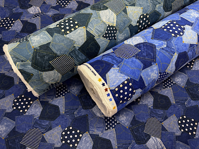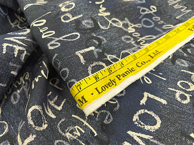 キルト作家武石正子さんプロデュース!「Love」「peace」「enjoy」などの英語が書かれたデニムをプリントで再現したシーチングプリント生地です。