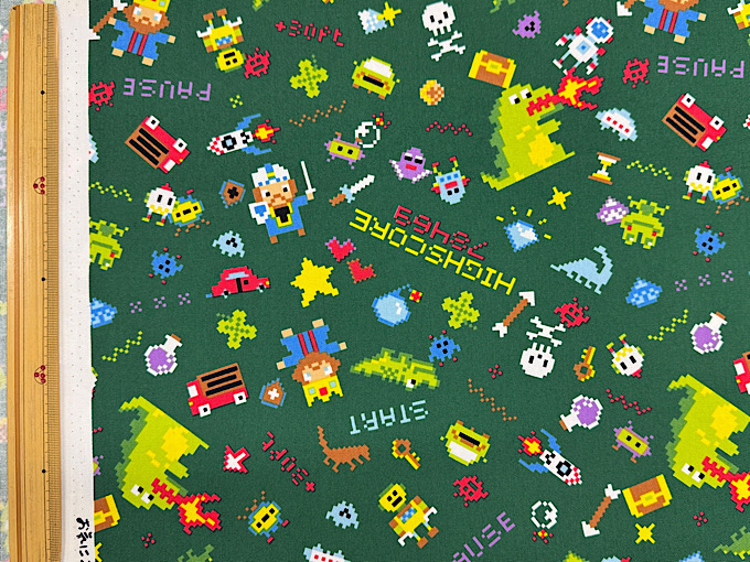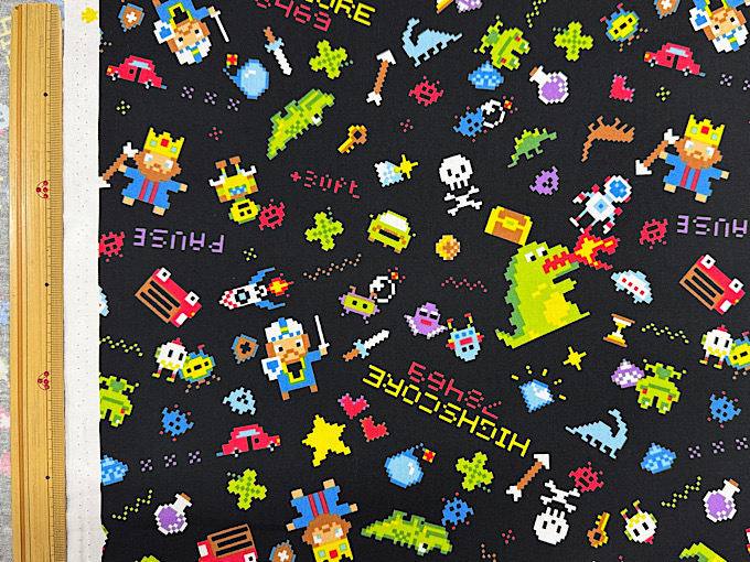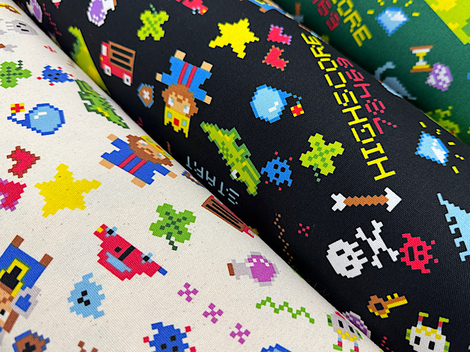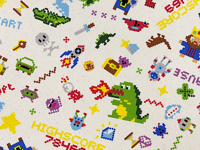 ドット絵が楽しいゲームチックなオックスプリント生地です。使いやすい柄の大きさなので巾着や体操服入れにもばっちり!