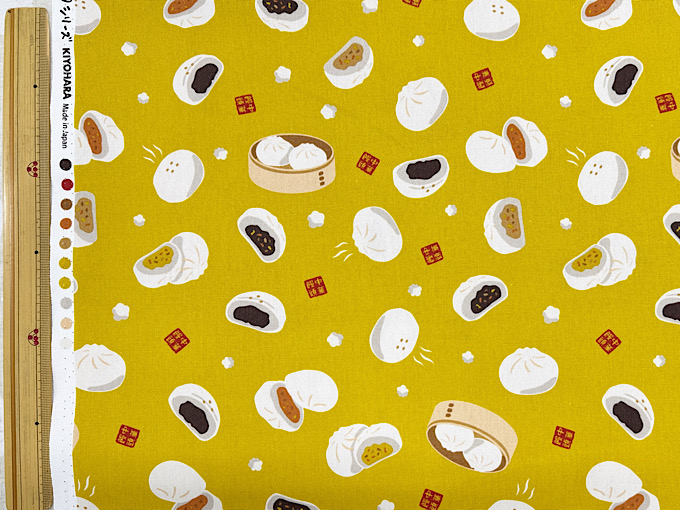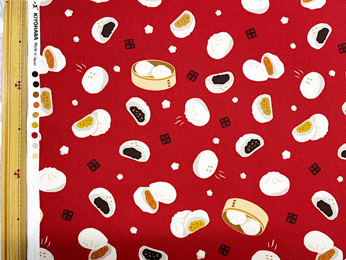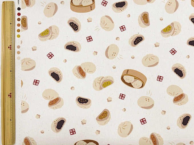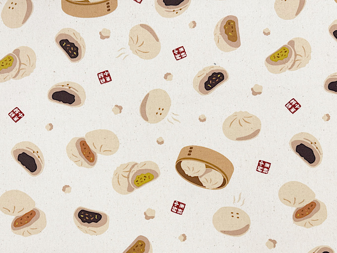 ほかほかの中華まんがおいしそうなオックスプリント生地です。使いやすい柄の大きさなので巾着や体操服入れにもばっちり!