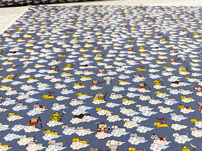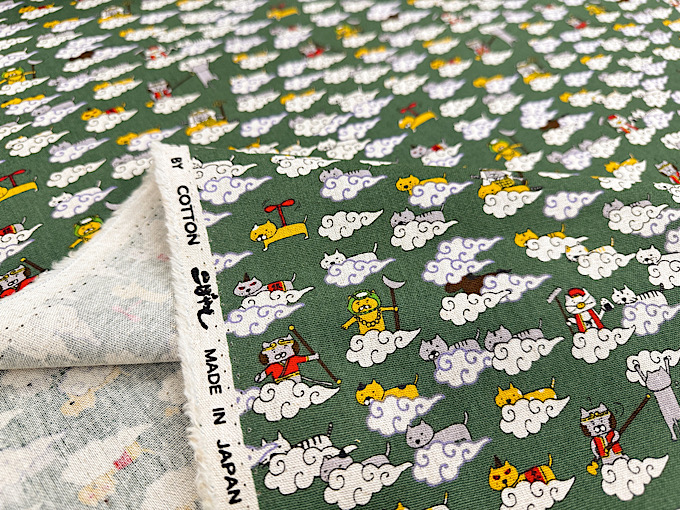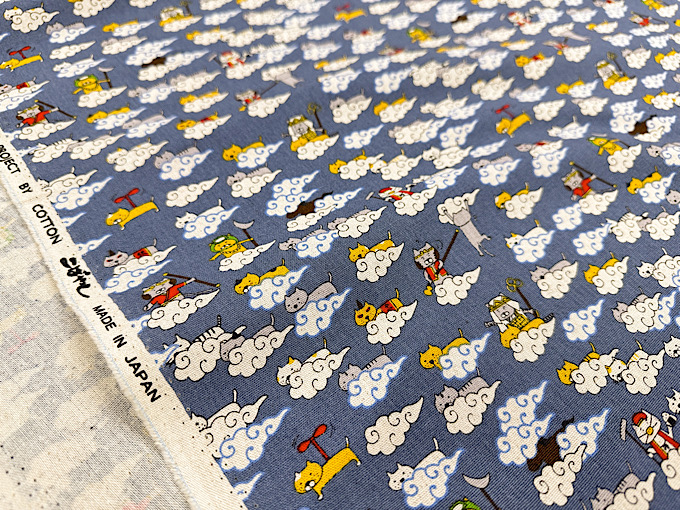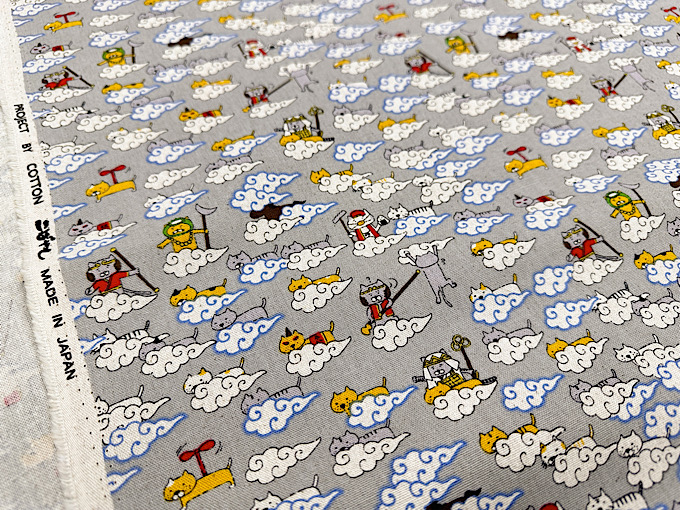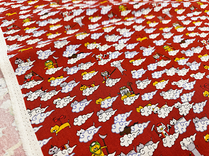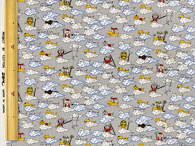 猫武将とユニークな家紋が並んだ、和調綿麻キャンバスプリント生地です