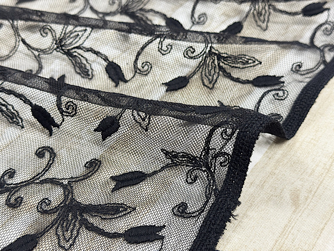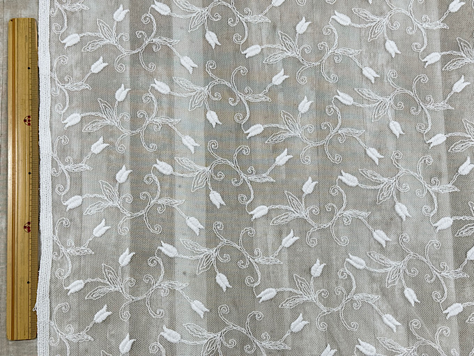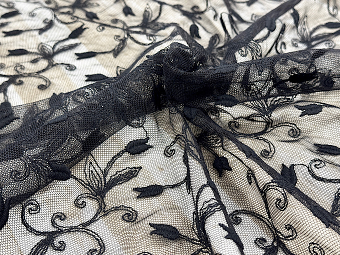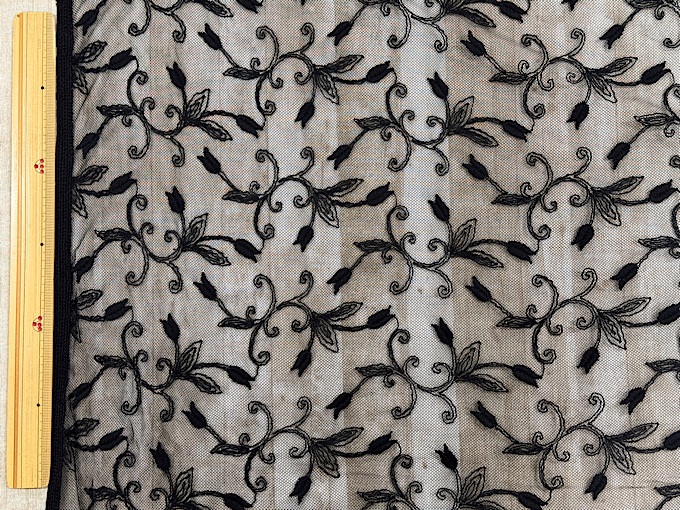 伸縮素材のチュールに、上品なお花とツタのデザインが刺しゅうされたエレガントなチュールレース生地です。