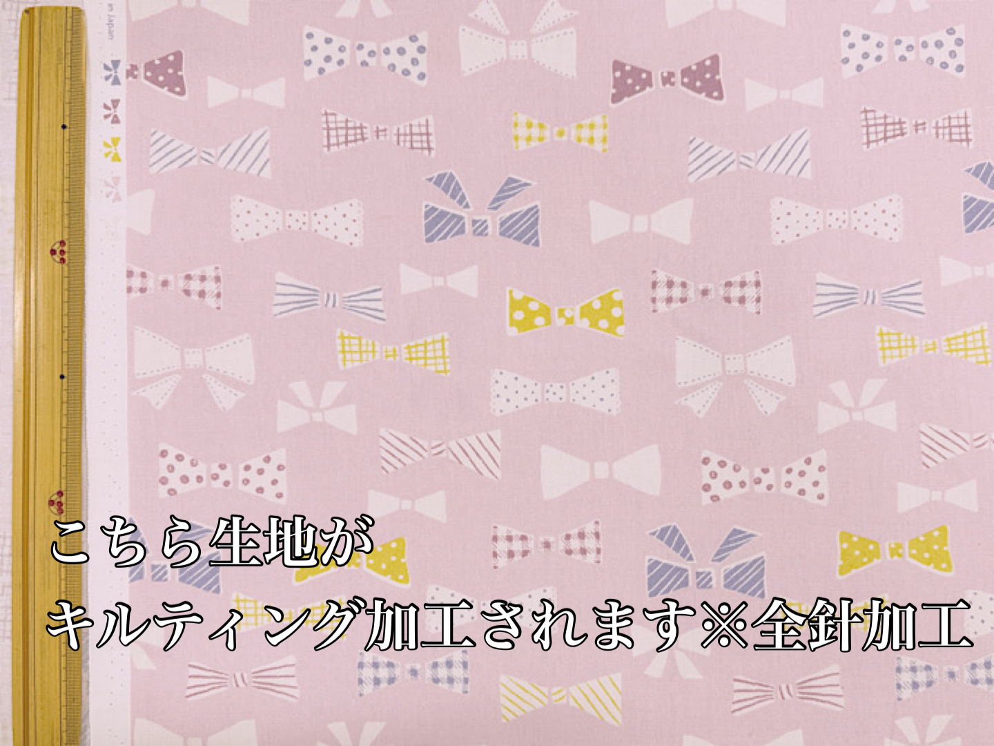 リボンに模様と柄が付いたかわいらしいオックスプリントキルティング生地です。レッスンバッグやシューズバッグなど、入園入学グッズの制作に一押しです♪