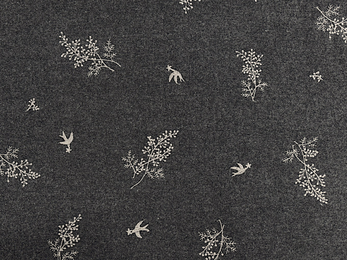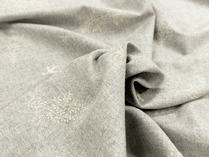 飽きのこないナチュラルな雰囲気の生地です。こちらはかわいいミモザと小鳥を刺繍しました。肌触りがとてもよいのでワンピースやシャツ、スカートなどお洋服のお仕立てにぴったりの生地です。