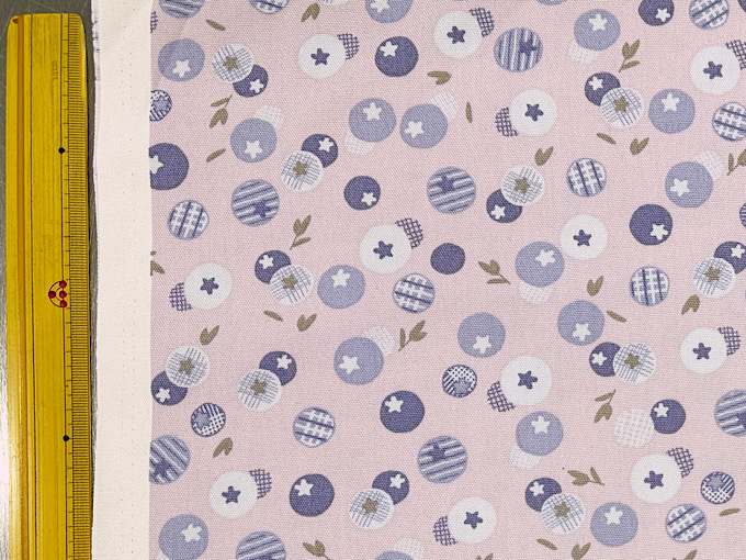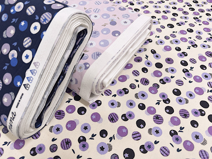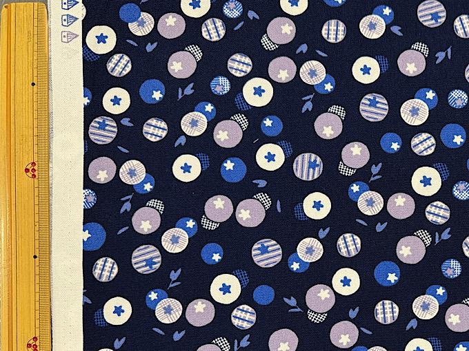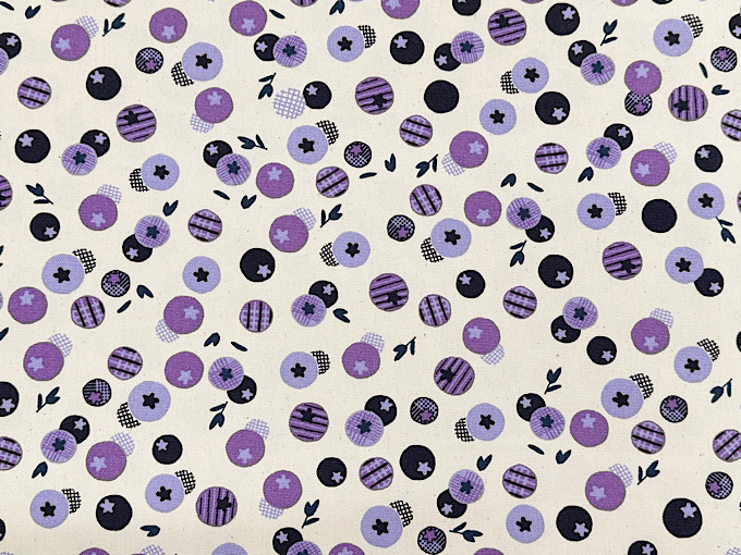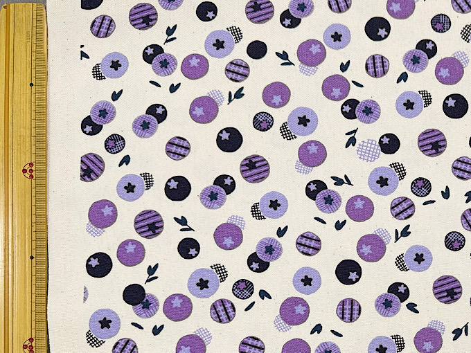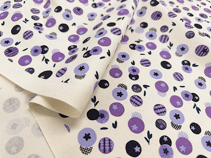 かわいいブルーベリーが生地にいっぱい!北欧調の雰囲気を持ったオックスプリント生地です。程よい厚みのオックスプリント生地なので、スカートやシャツ、バッグ、エプロンなどのハンドメイドにおすすめです。