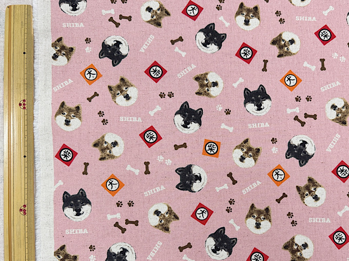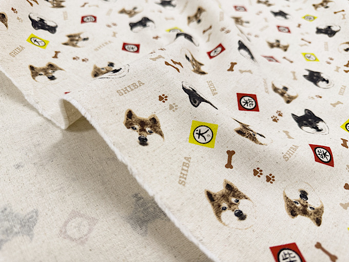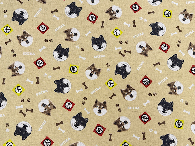 柴犬柴犬柴犬!柴犬のかわいいお顔がたくさんプリントされた綿麻キャンバスプリント生地です。「SHIBA」「犬」のロゴやホネ、肉球もちりばめられていてSo cute!。トートバッグやエプロンなどの生活雑貨制作、クッションなどのインテリアカバーのハンドメイドにおすすめです。