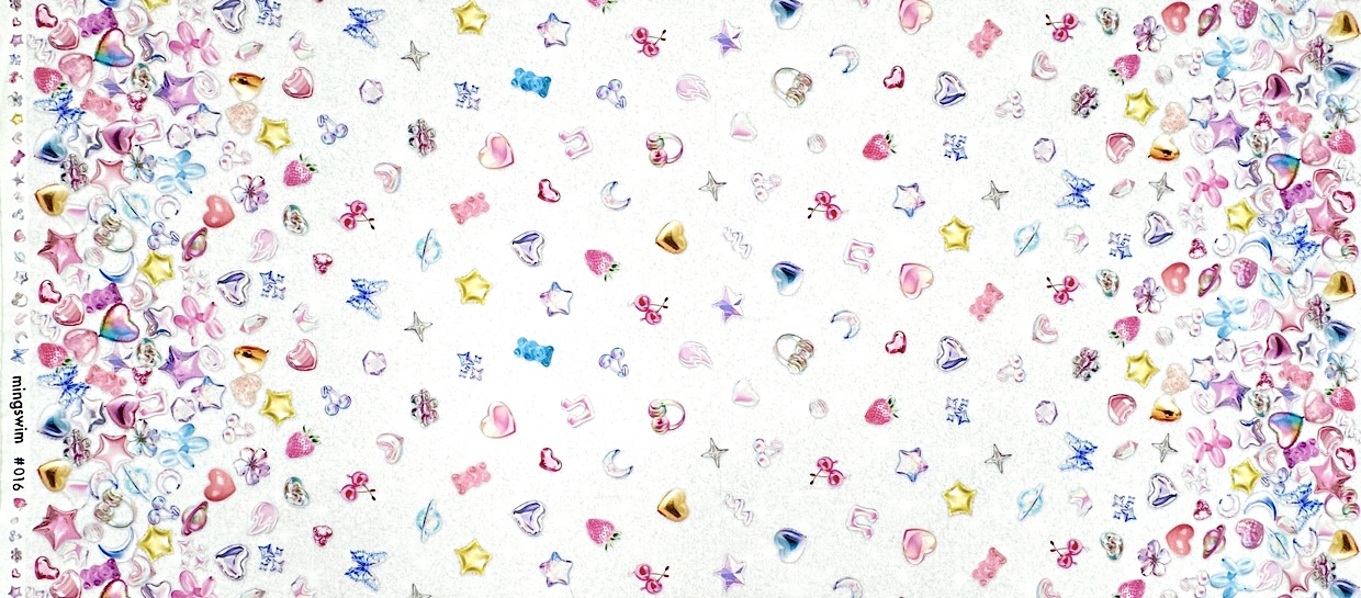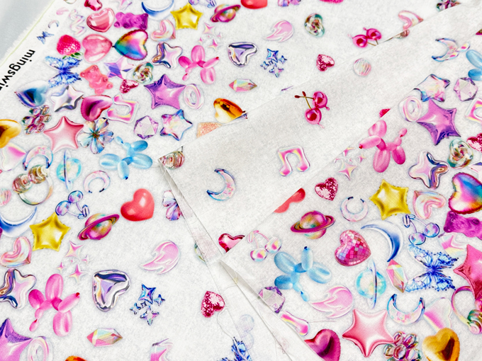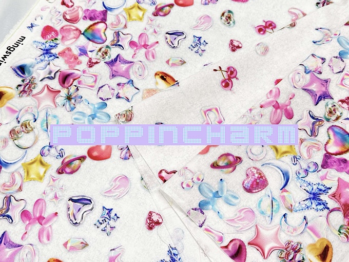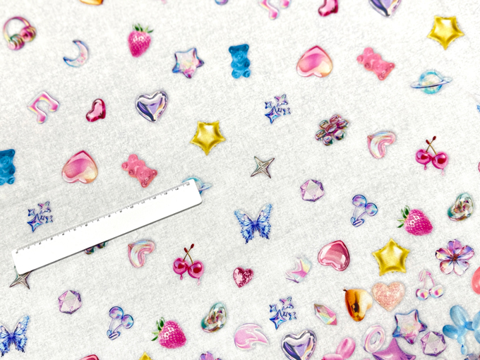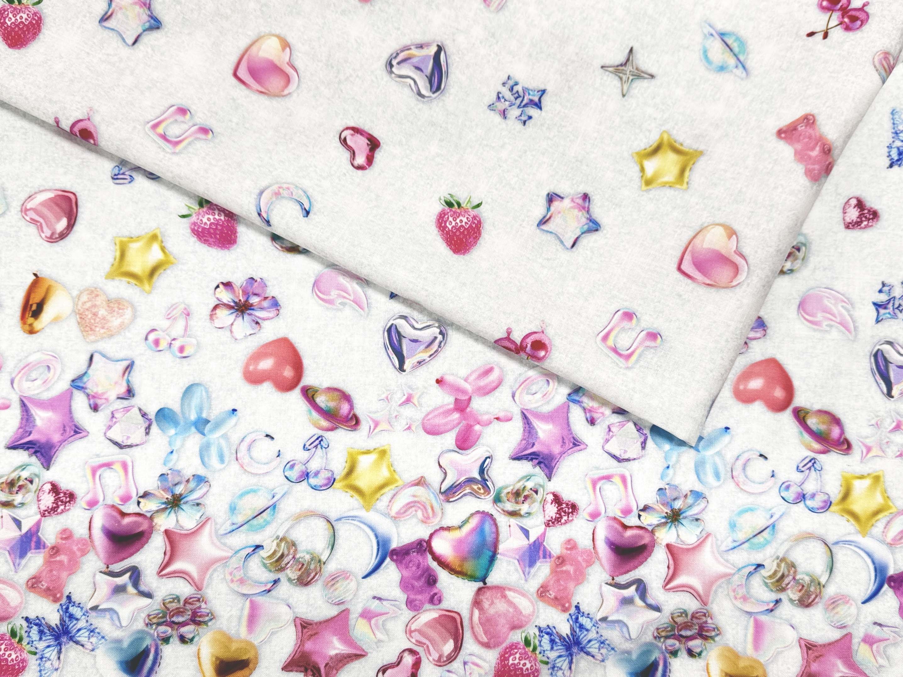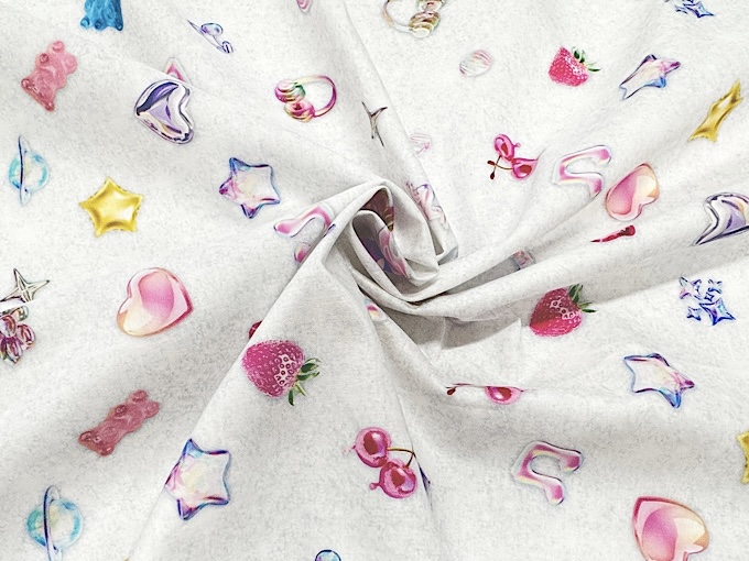 小さめなハートがランダムに配置された、かわいらしい韓国調のスケアープリント生地です