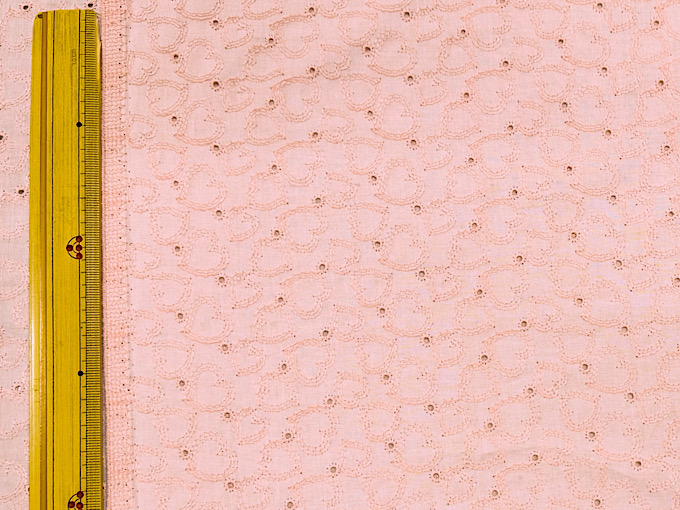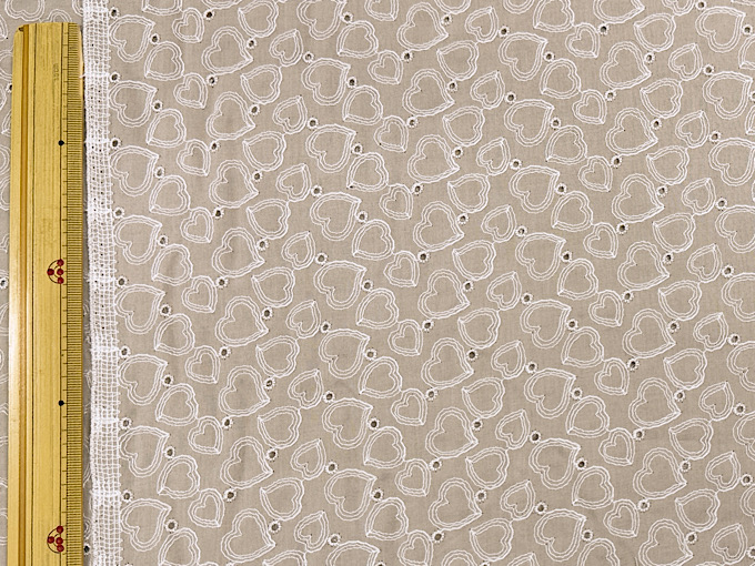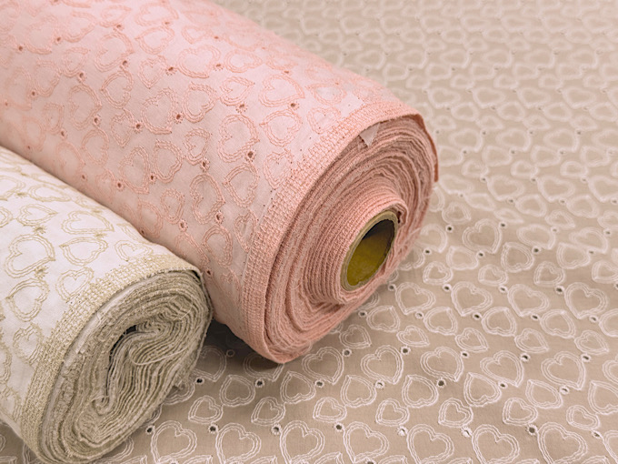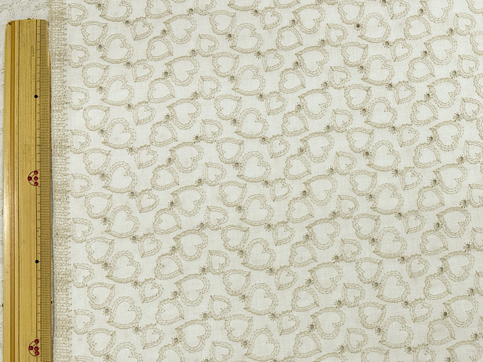 細やかで美しい刺しゅうが施された、上質なコットンローンレース生地です。かわいらしいハート模様の刺しゅうが生地いっぱいに施されており、ブラウスやワンピースなどのお洋服から、バッグ・ポーチなどの小物雑貨のハンドメイドまで幅広くお使いいただけます。
