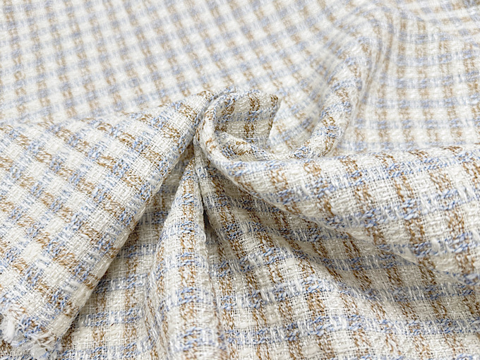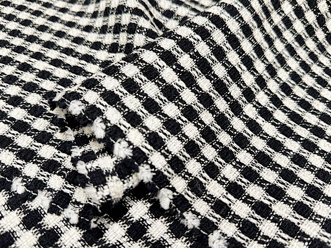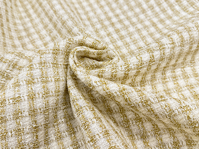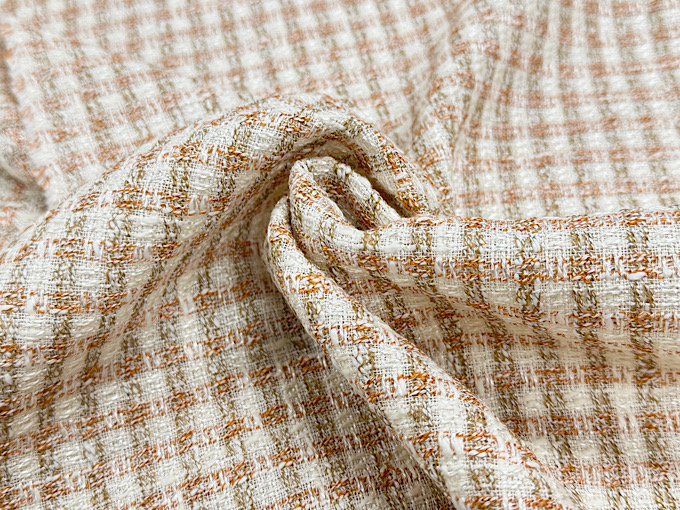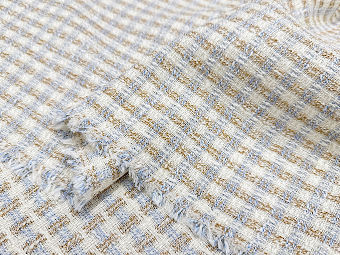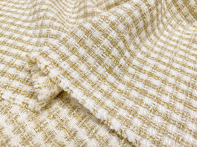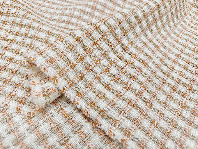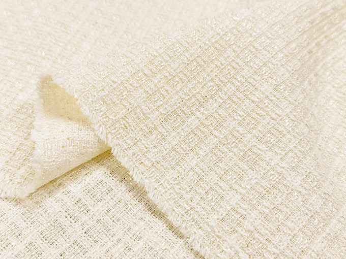 世界的にも評価される高品質な織物の名産地「尾州」で生産された、かわいらしく気品のあるファンシーツイード生地です。様々な種類の「意匠糸」を巧みに組み合わせて織り上げることで、複雑で美しい豊かな表情を持ったツイード生地に仕上がっております。また、レーヨンが混紡され落ち感と上品なツヤがございます。華やかで美しい印象のファンシーツイード生地なので、ジャケット、ワンピース、スカートといったお洋服のハンドメイドからバッグ、ポーチなどの製作まで幅広いハンドメイドにおすすめです。メイドインジャパンの高品質なツイード生地、この機会に是非。