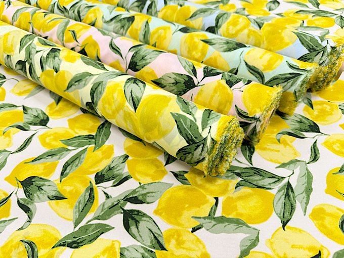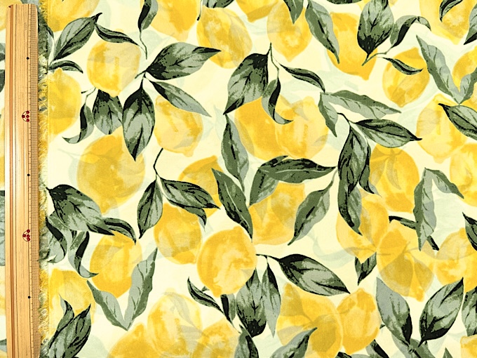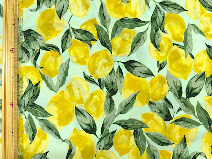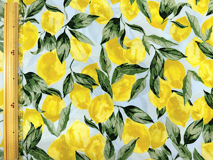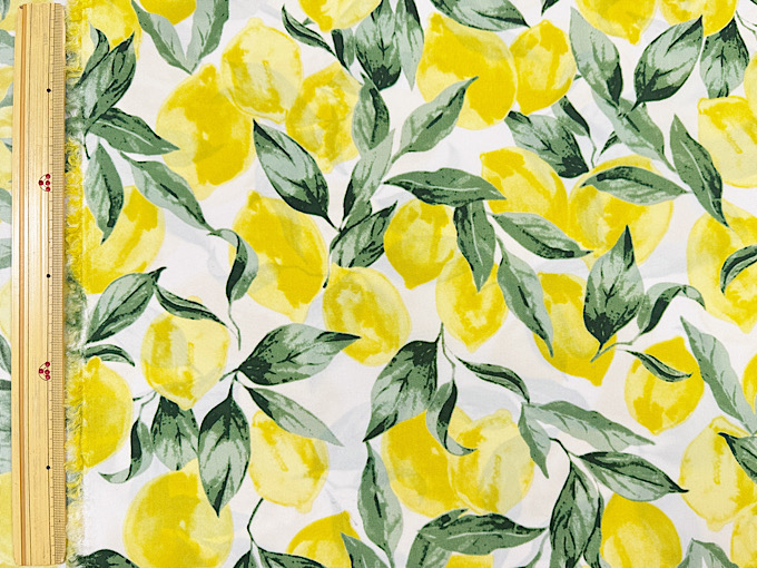 撥水加工つき!たっぷりなレモンがかわいいナイロンオックスプリント生地です。
