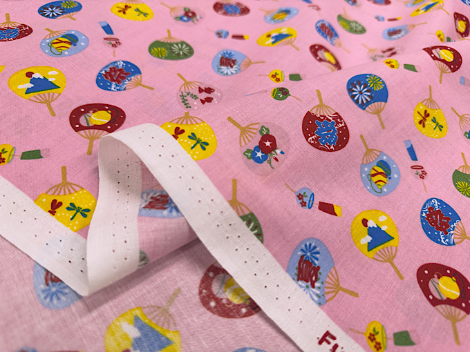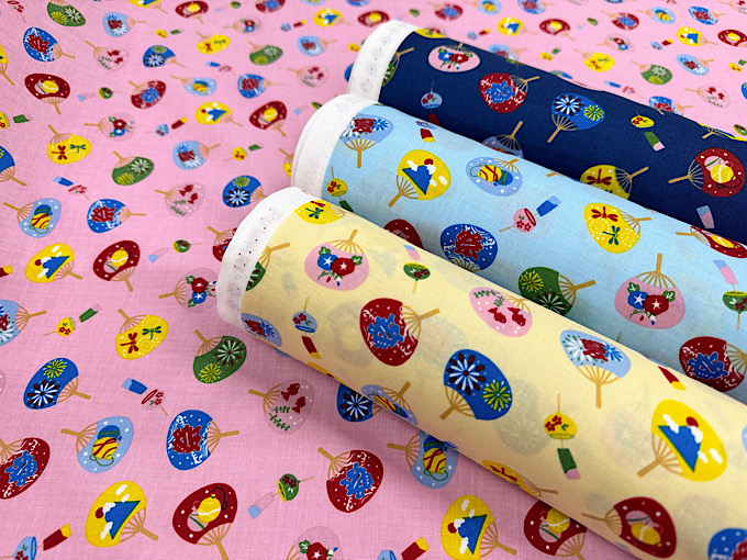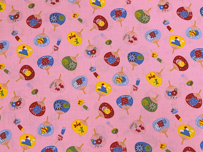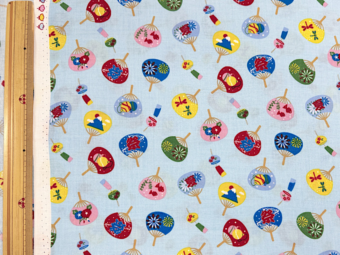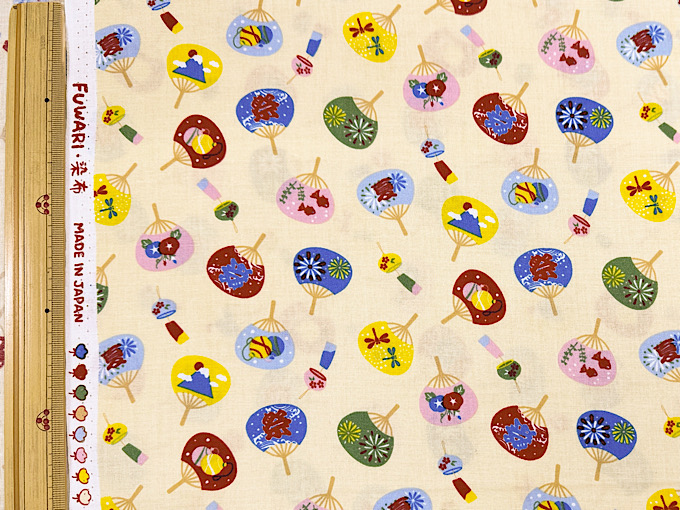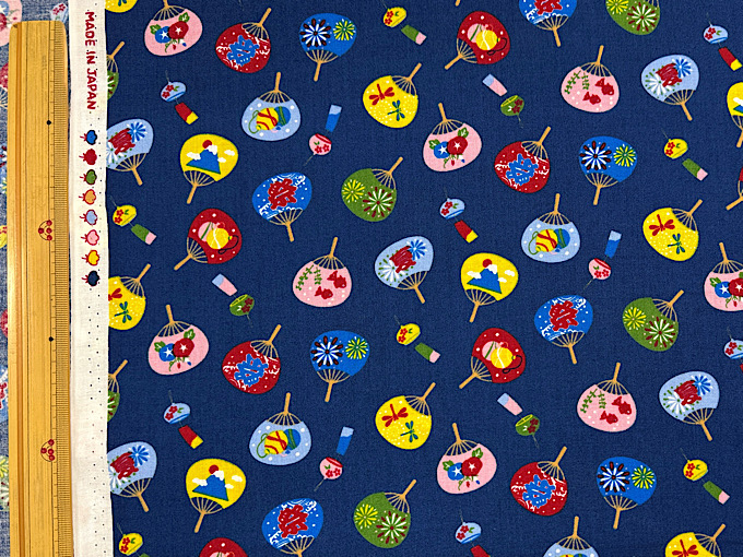 数量限定特価!団扇(うちわ)に富士山や「祭」の文字などがデザインされた楽しいスケアープリント生地です。扱いやすい薄めのスケアープリント生地なので、パッチワークはもちろん、お洋服やポーチなどのハンドメイドにもおすすめです。