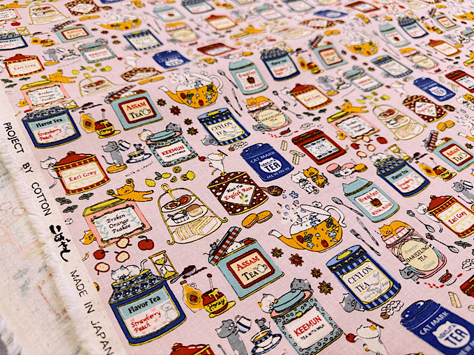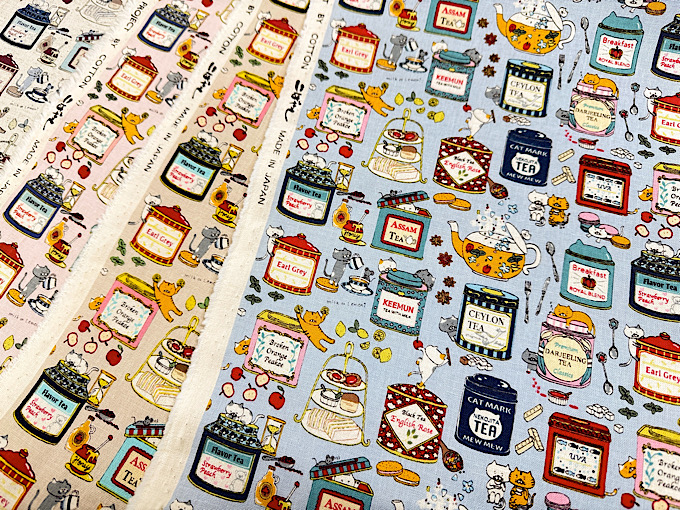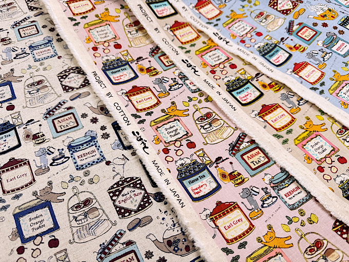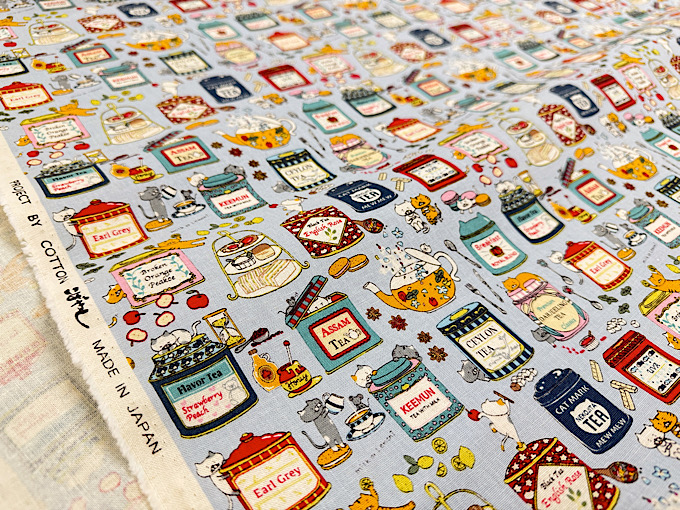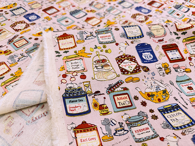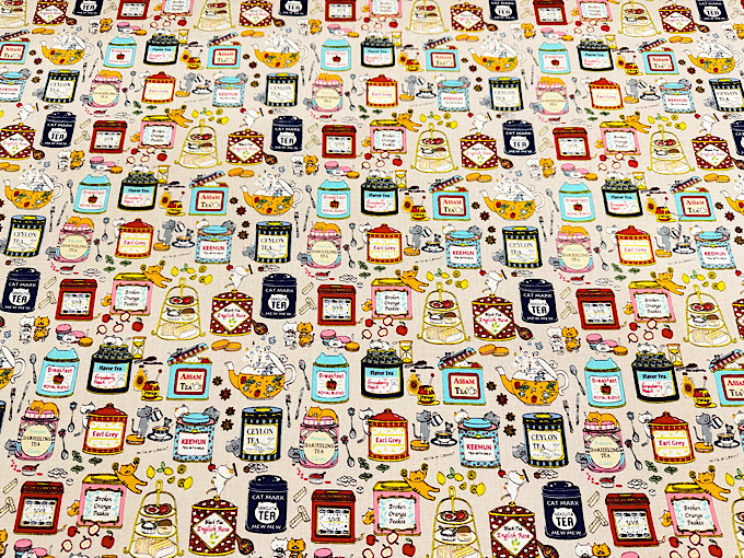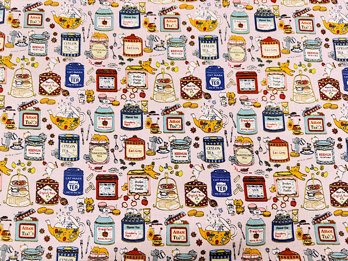 『小林繊維』 色んな種類のイチゴになりきった猫さんがジャムの瓶と一緒にならんだコットンキャンバスプリント布地です