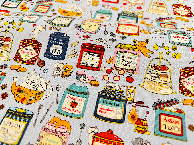 『小林繊維』 パカーンと割れた果物の間でゆらゆらダンスする猫さんがユニークなコットンキャンバスプリント布地です