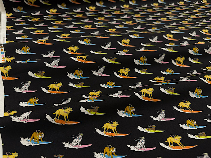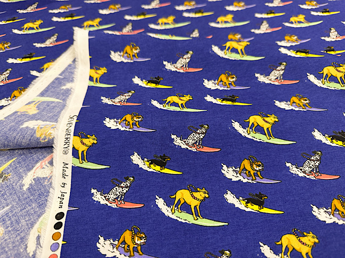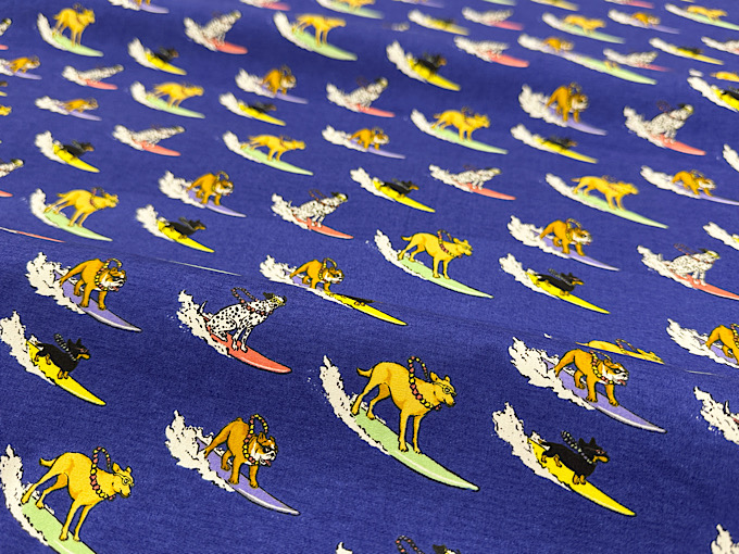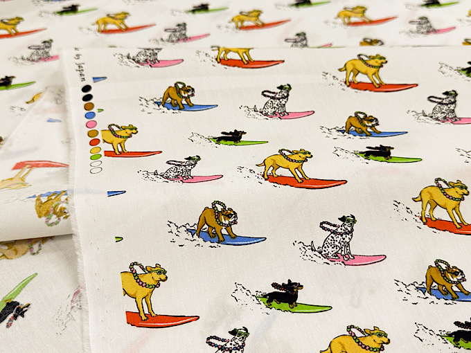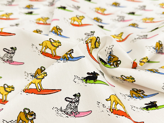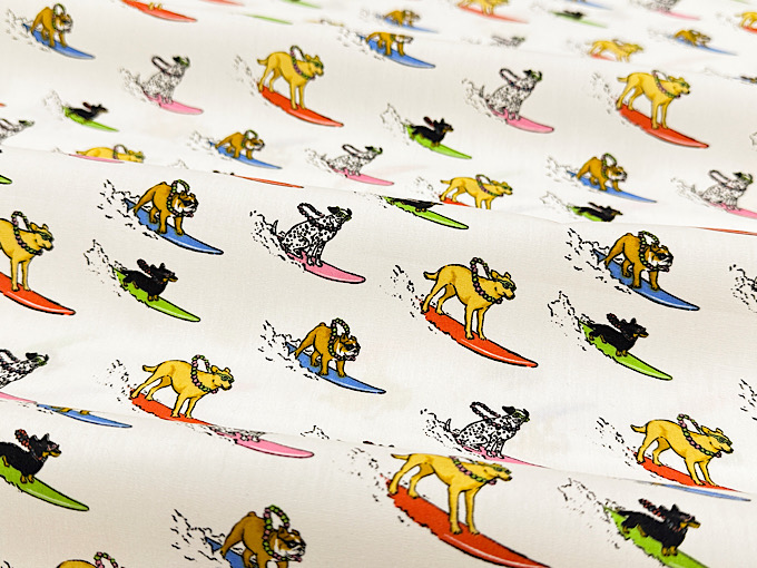 こちらの商品は、ワンちゃんたちが並んでサーフィンを楽しむ様子が粋なブロードプリントファブリックです。シャツやスカートなどのお洋服からバッグ・ポーチなどの雑貨制作まで、柄を活かした作品づくりをお楽しみくださいませ。