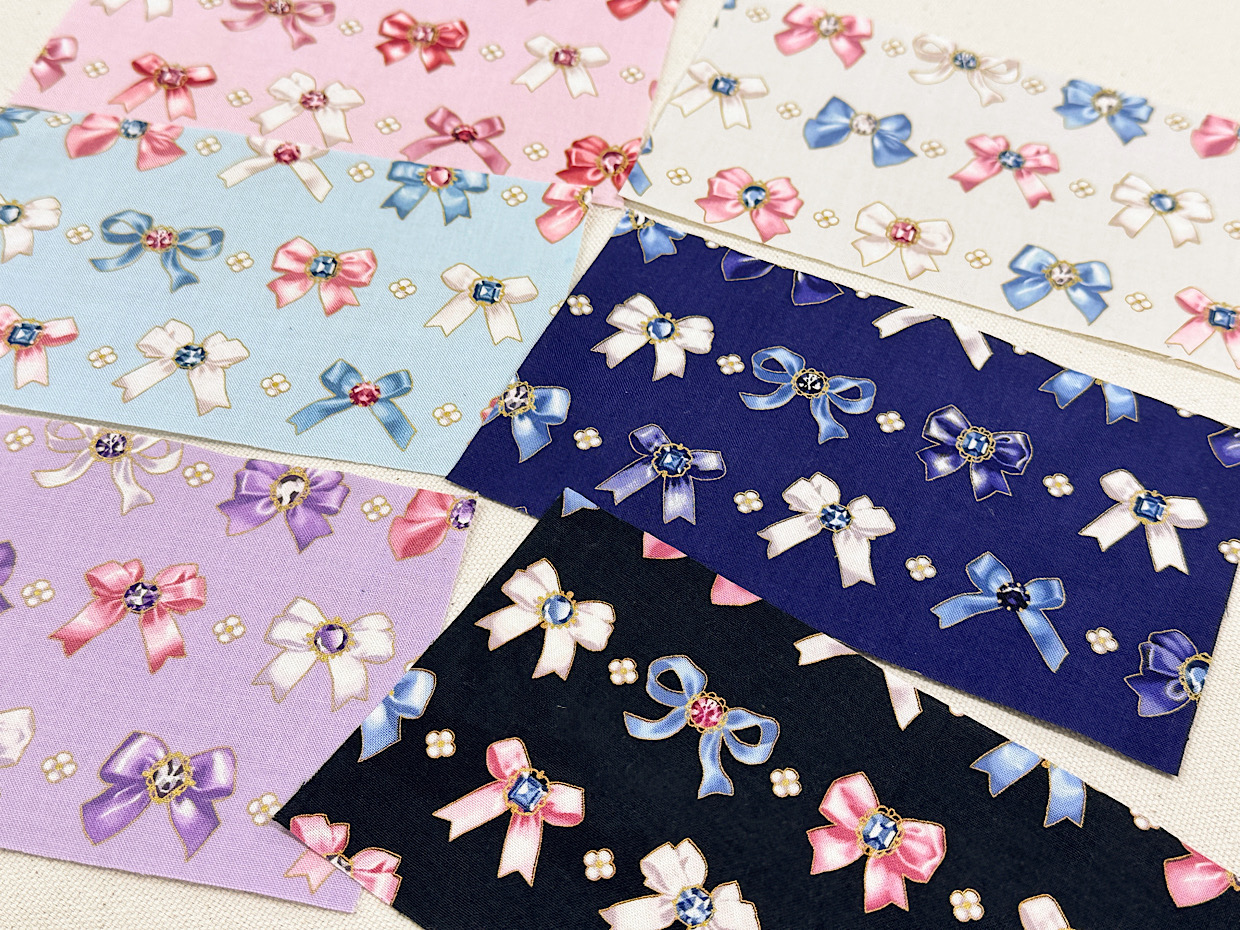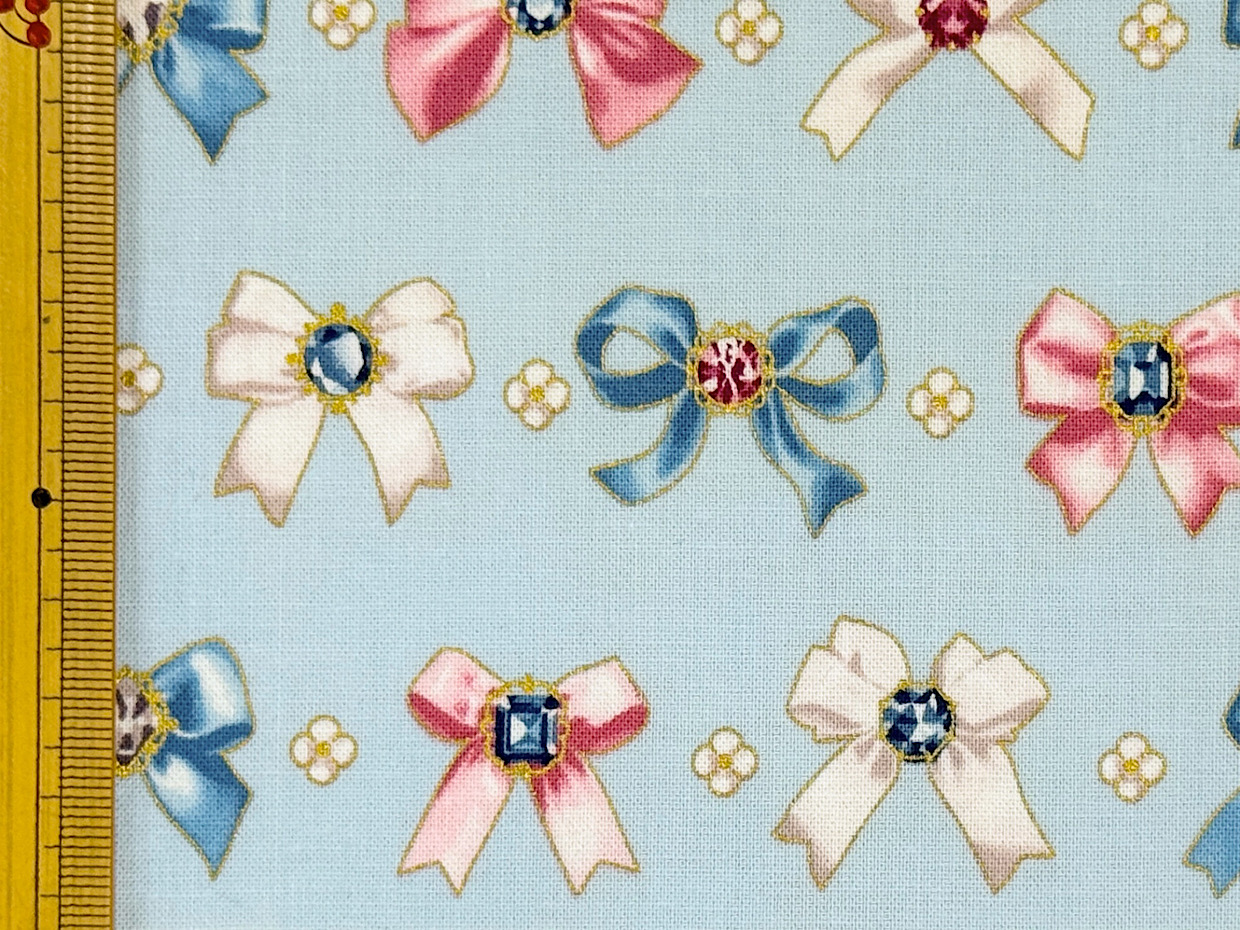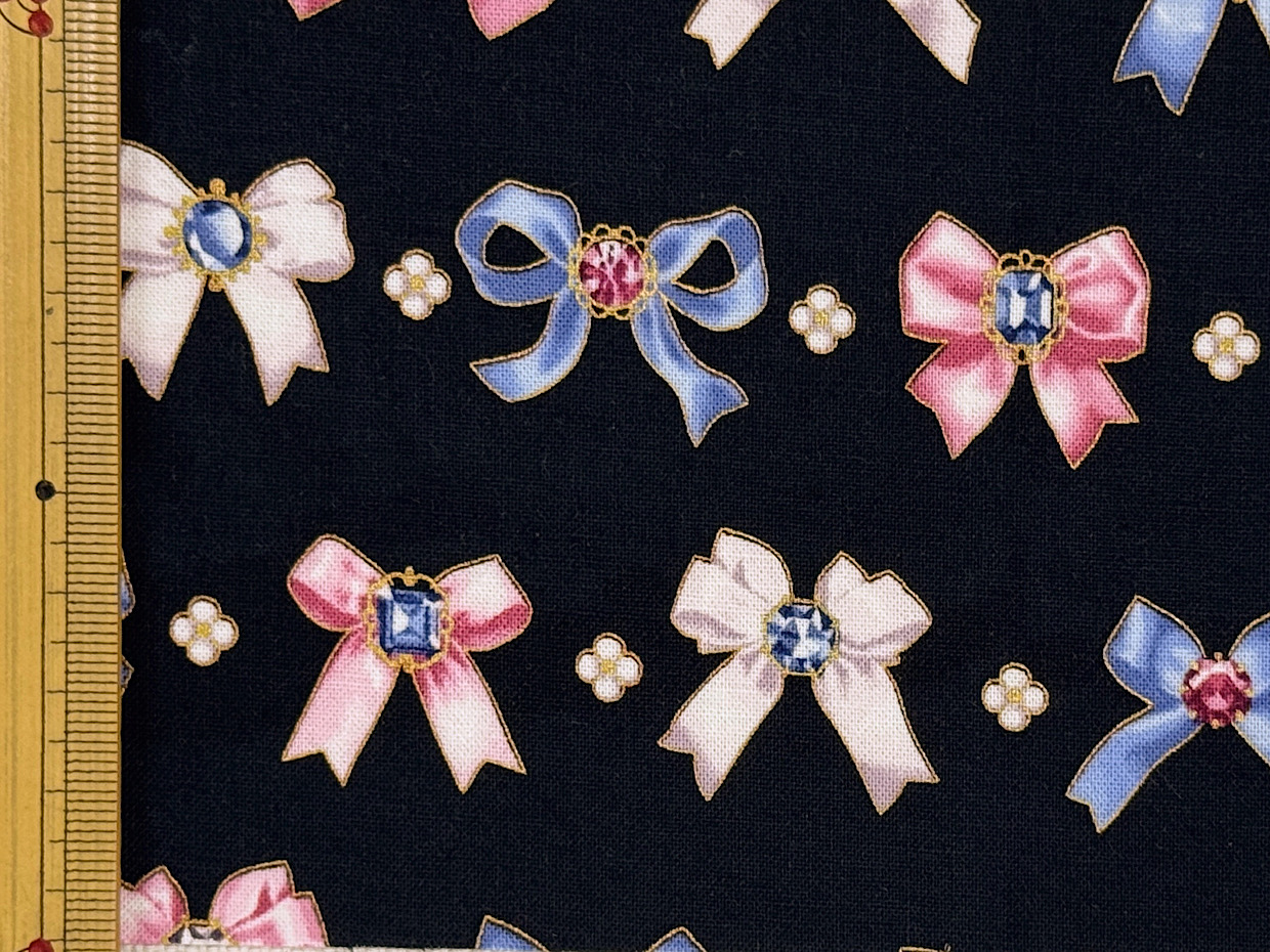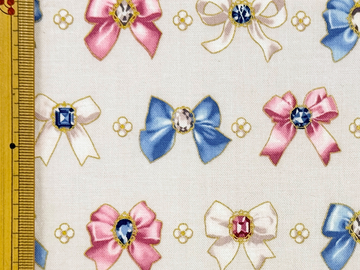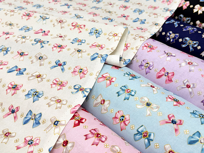 ゴールドカラー入りで、キラキラのビジュー付きリボンがたくさん並んだ華やか&キュートなプリント生地です。リボンのモチーフもお使いいただきやすい程よいサイズ感になっております。扱いやすいシーチングプリント生地なので、バッグやポーチ、お洋服などのハンドメイドにおすすめです。