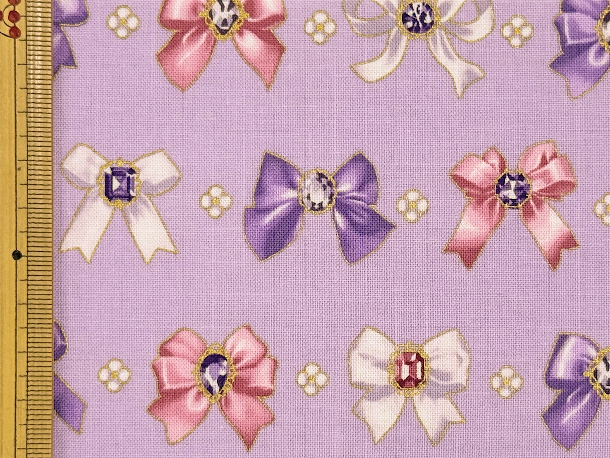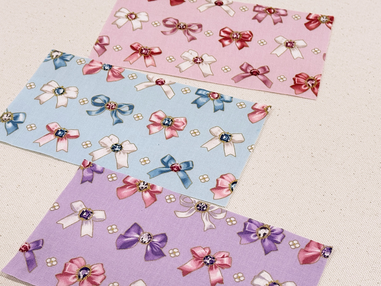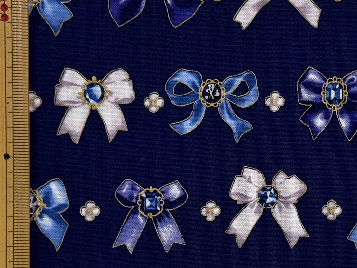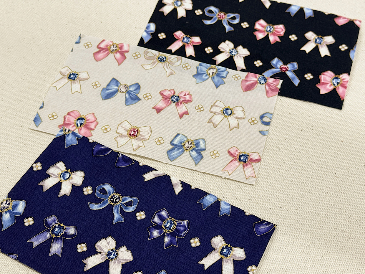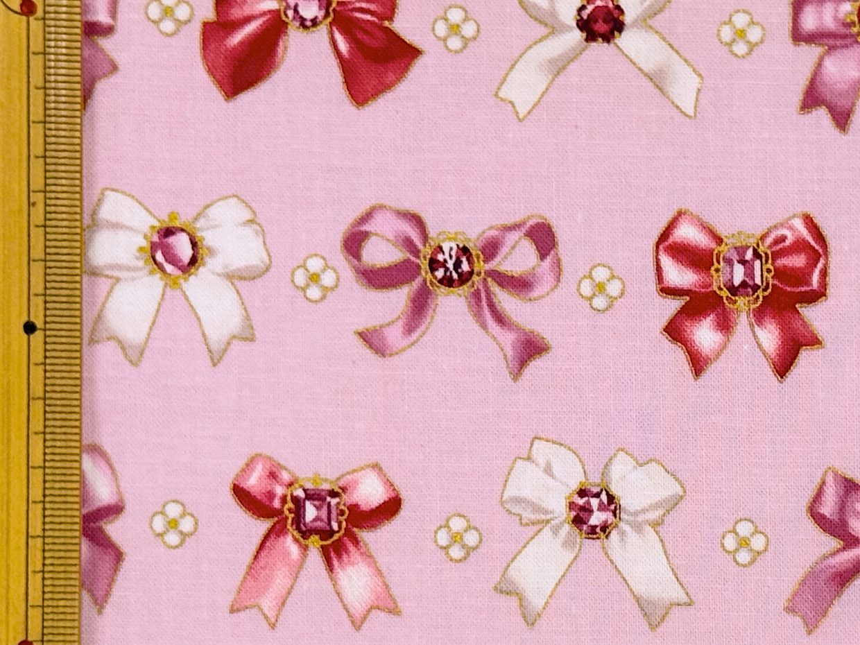 ゴールドカラー入りで、キラキラのビジュー付きリボンがたくさん並んだ華やか&キュートなプリント生地です。リボンのモチーフもお使いいただきやすい程よいサイズ感になっております。扱いやすいシーチングプリント生地なので、バッグやポーチ、お洋服などのハンドメイドにおすすめです。