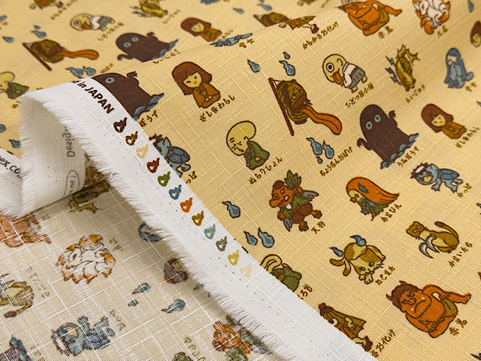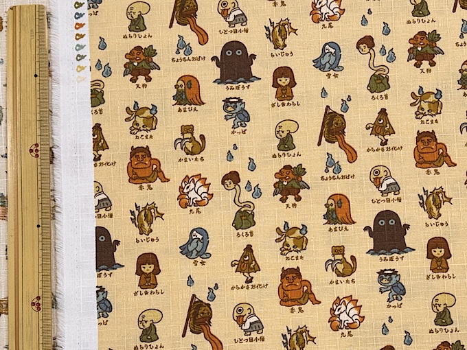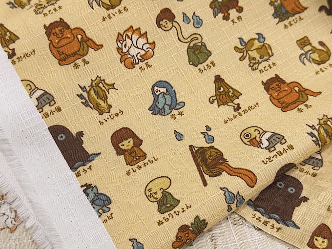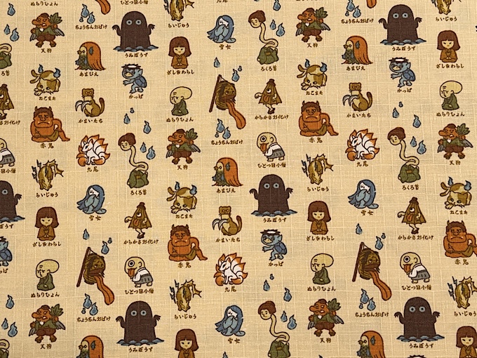 座敷わらし、唐傘お化け、海坊主、ぬらりひょん…様々な妖怪が集まった楽しいドビープリント生地です。和風のハンドメイドと相性が抜群のコットンドビー生地なのでがま口や御朱印帳のカバー、座布団、ポーチ、バッグなど様々な作品にお使いただけます。