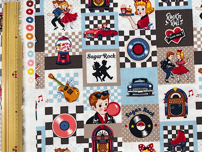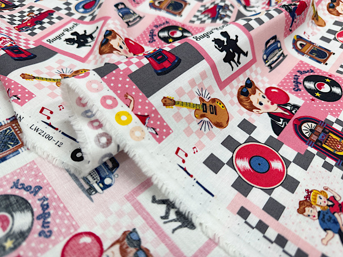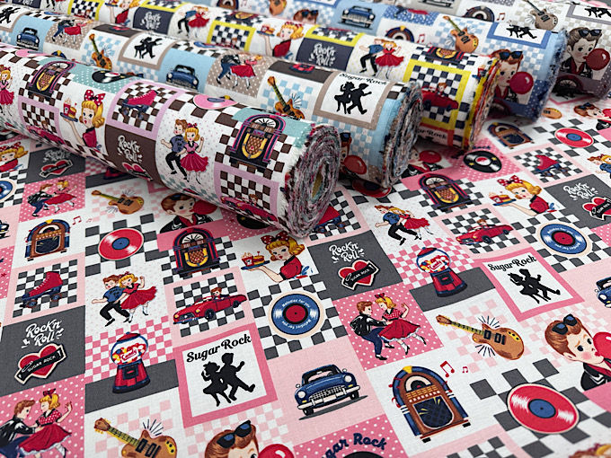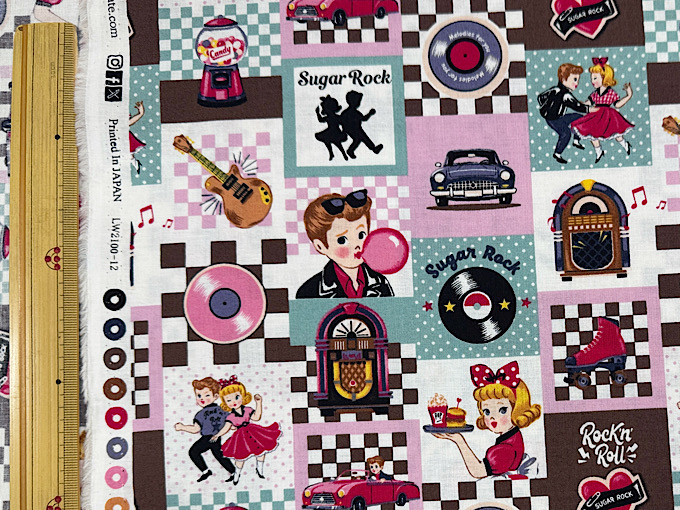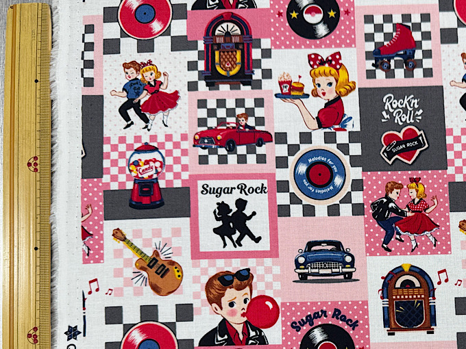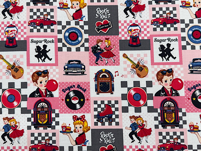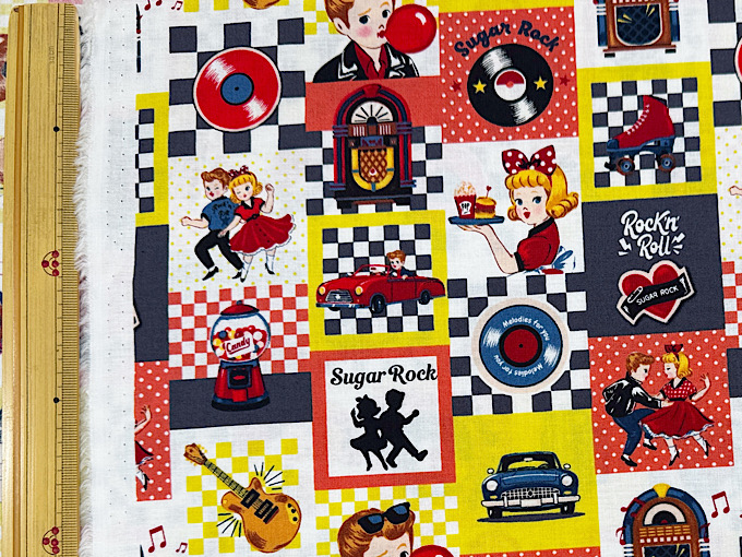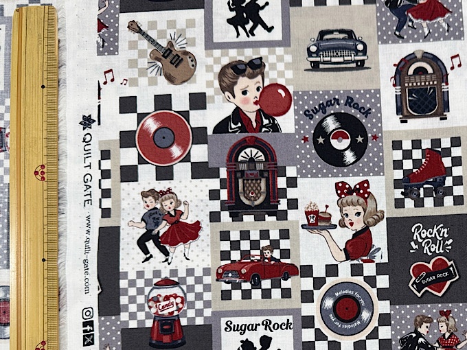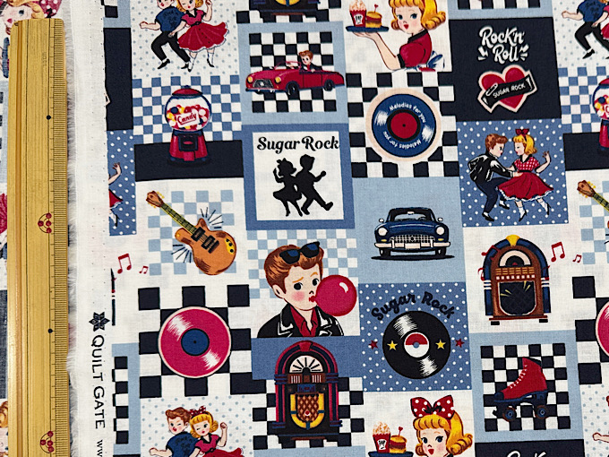 QUILT GATE(キルトゲイト) 【Sugar Rock (シュガーロック)】 レコードやエレキギター、ミュージックボックスなどレトロなアメリカンテイストがかわいいシャーティングプリント生地です