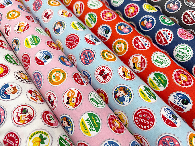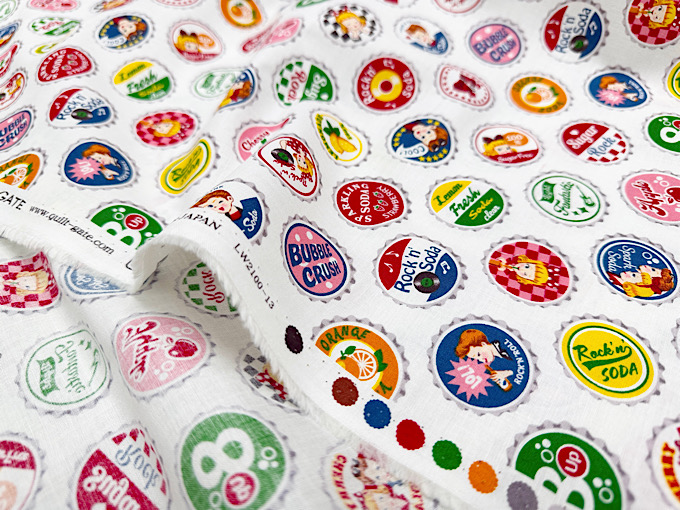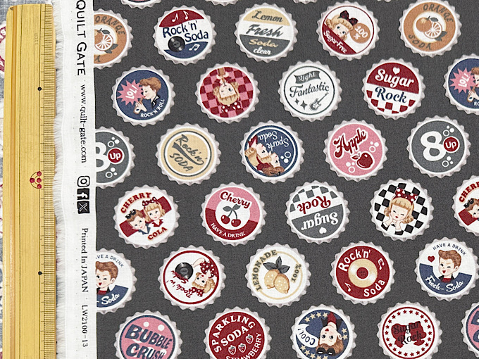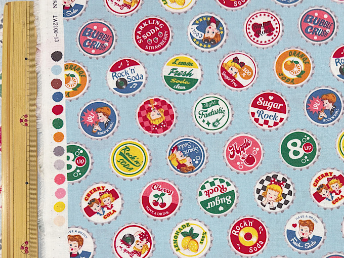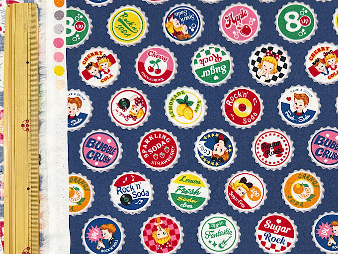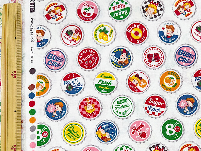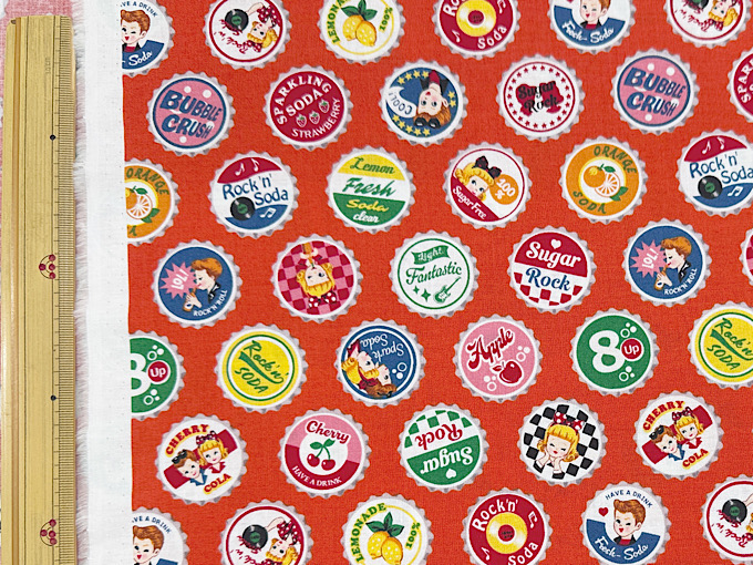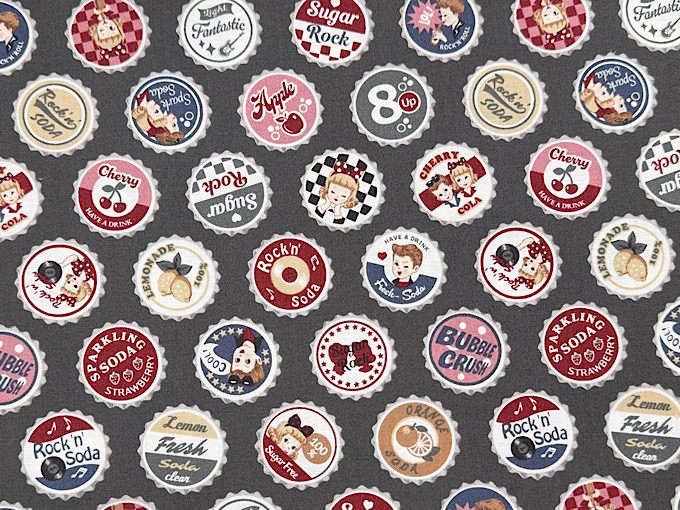 アメリカンレトロなデザインが施された瓶のふた(王冠)がかわいらしいシャーティングプリント生地です。細かなデザインの違いに注目♪