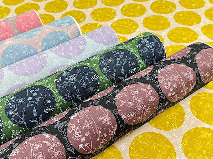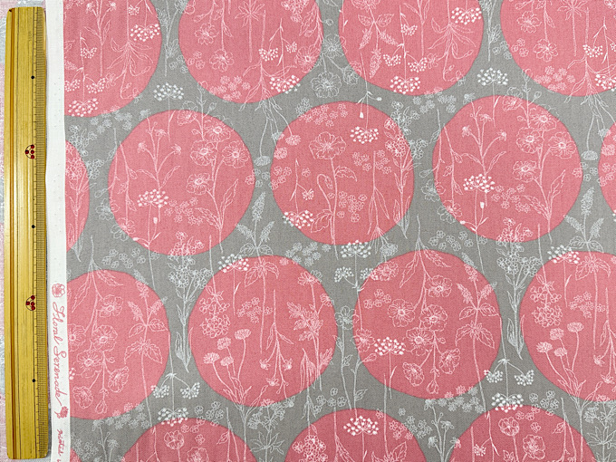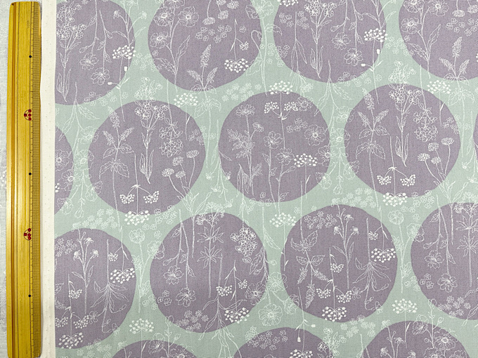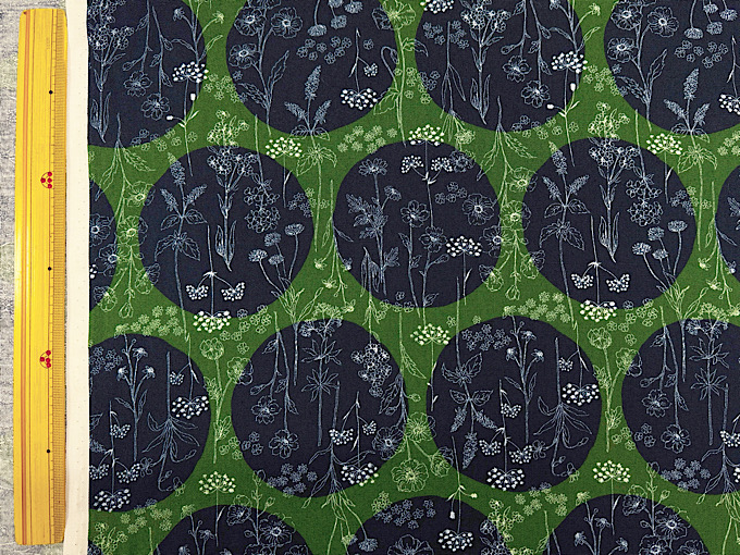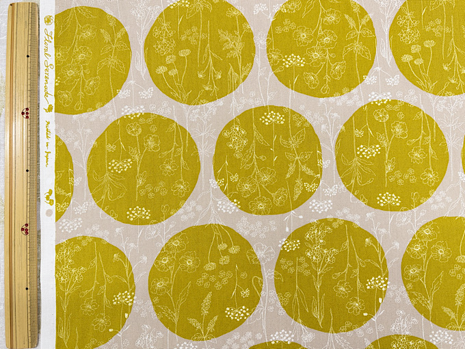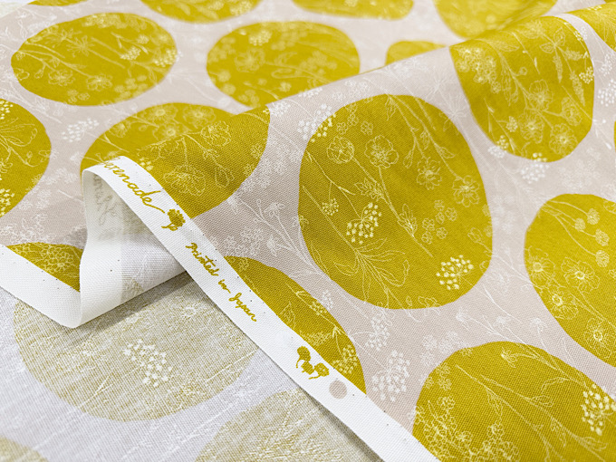 大きなドットをベースにラッカーで植物を描いたかわいいオックスプリント生地です。程よい厚みのオックスプリント生地なので、スカートやシャツ、バッグ、エプロンなどのハンドメイドにおすすめです。