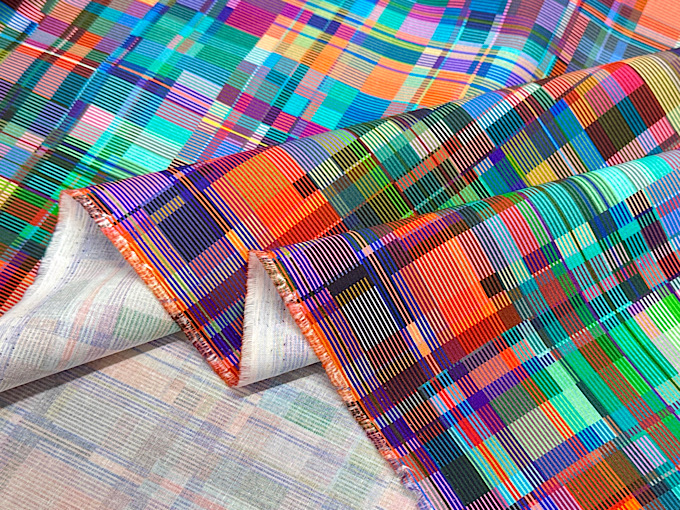 デジタルプリントの良さを活かした色鮮やかで個性的なチェック模様のシーチングプリントファブリックです。