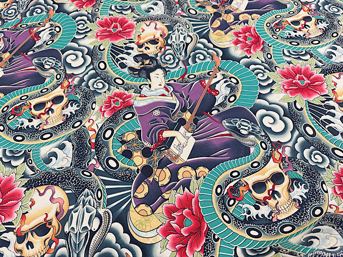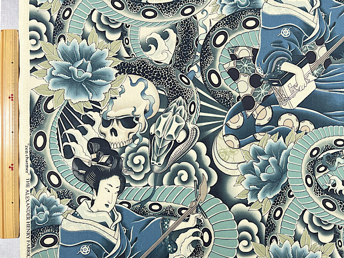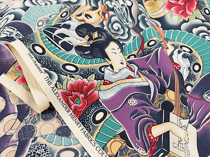 映画館に掲示してありそうな、どこかで見たような気のする、映画ポスターモチーフのオックスプリント生地です