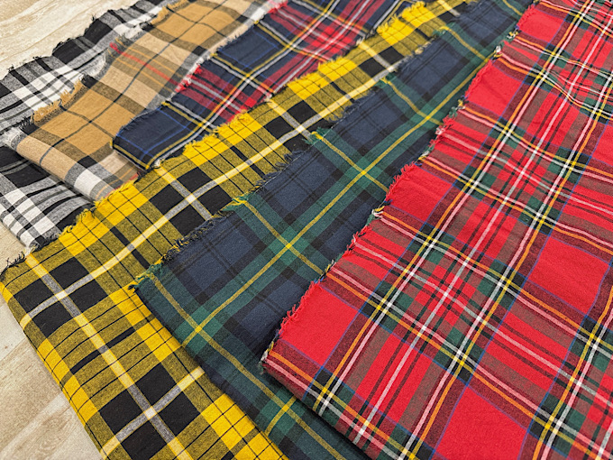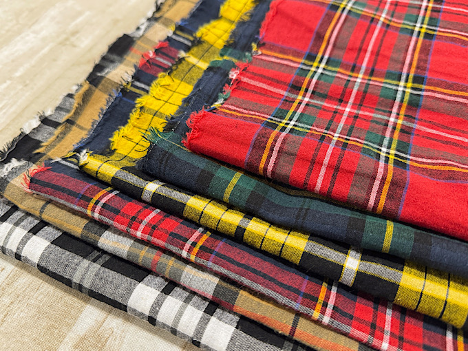 大き目のタータンチェックと落ち着いた色使いが目を惹く、先染の綿麻平織ファブリックです 既製品ライクなお洋服づくりにおすすめの商品でございます
