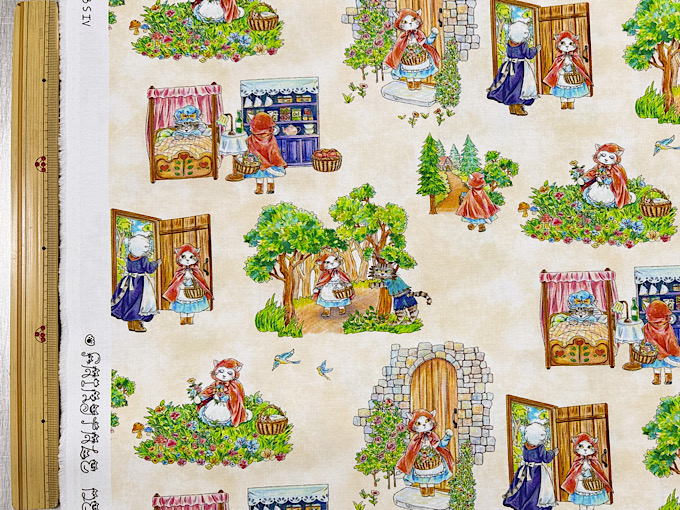 おとぎ話の登場人物がすべて猫になったかわいいデジタルシーチングプリント生地です。こちらはドキドキなお話が展開されていく「赤ずきんちゃん」柄です。シャツやスカート、ワンピースといったお洋服づくりからバッグやポーチなどのハンドメイドにおすすめです。